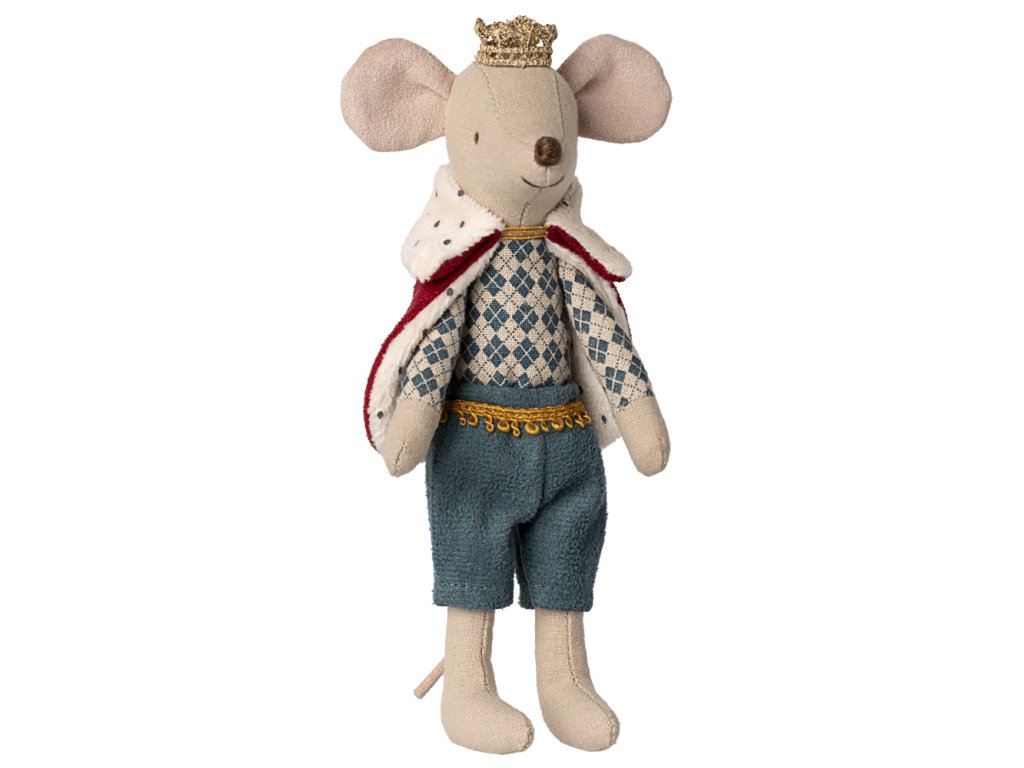 Má na sobě plášť a korunu a dokonale se hodí do zámecké síně.
