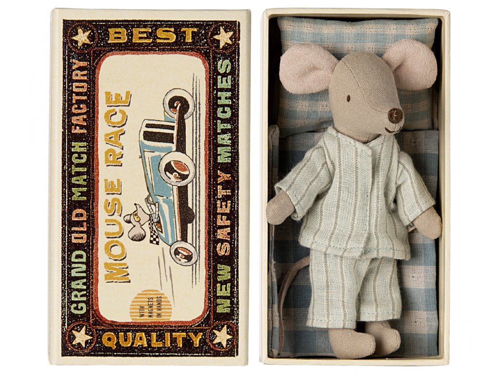 Velký bráška je v pyžamku a chystá se na kutě, chodí spinkat do své krabičky, kde má i peřinu a polštář.