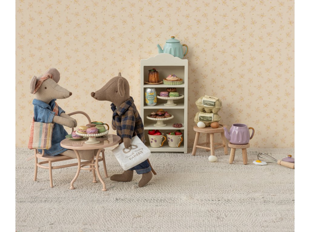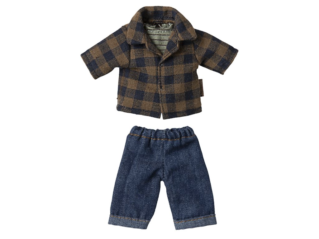 Myší tatínek v béžovém provedení nosí kostkovanou košili, tílko a džínové kalhoty.