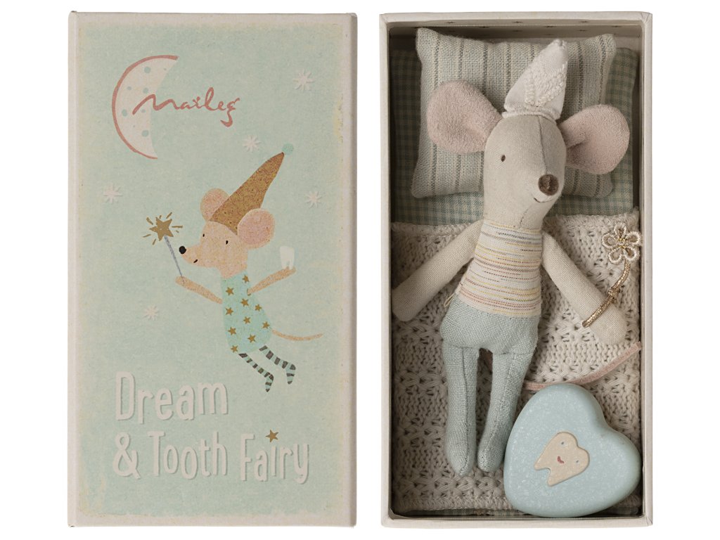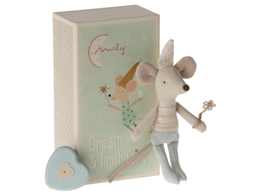 V noci zoubková víla šíří pohádkový prach, sbírá zoubky, přináší dětem dobrůtky a stará se o to, abyste měli sladké sny. Myší zoubková víla v lesklém klobouku a třpytivém batůžku - včetně krabičky na zuby a krabičky od zápalek. Batoh se může barevně lišit.