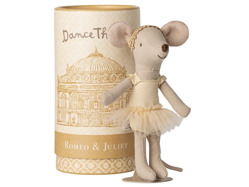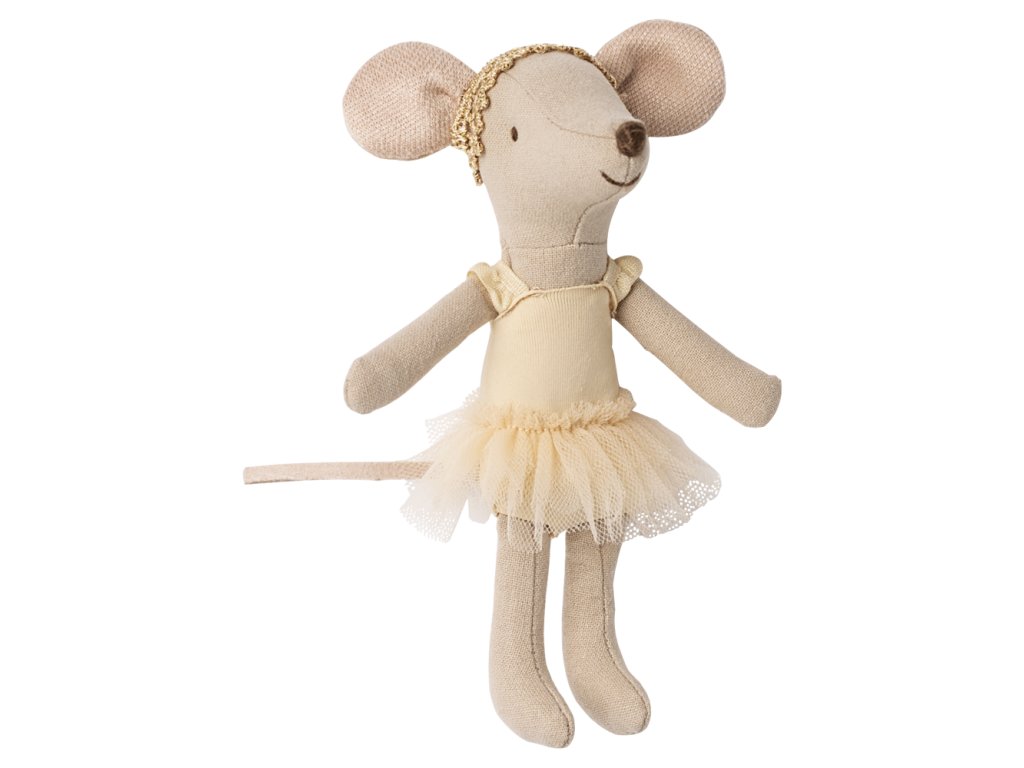 Tato myška velká sestra baletka má na sobě krásnou krémovou tutu sukýnku s dokonale ladící čelenkou.