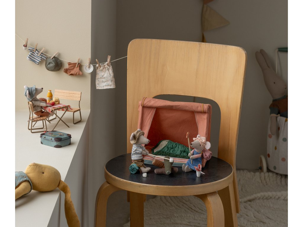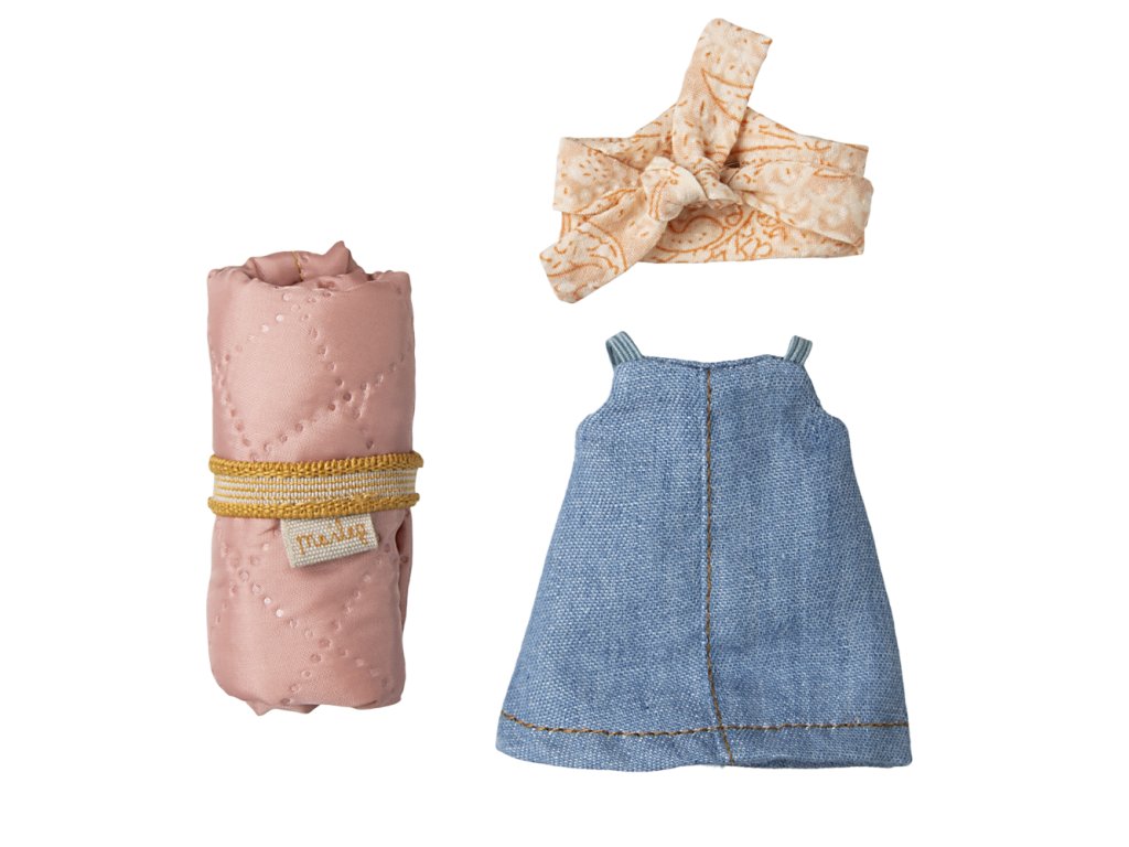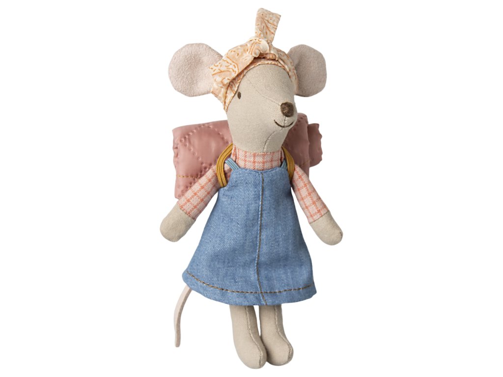 Myška turistka je plně vybavena na pěší výlet do divoké přírody, na zádech má srolovaný spacák, takže přespávačka pod širákem není
