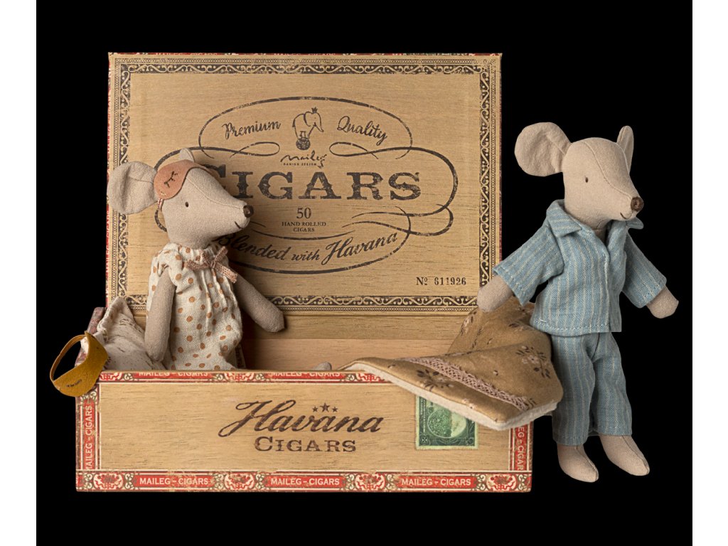 Myší máma a táta mají na sobě krásné pyžámka a masky na oči. Krabička na doutníky je perfektní postel pro dobrý spánek a sladké sny.