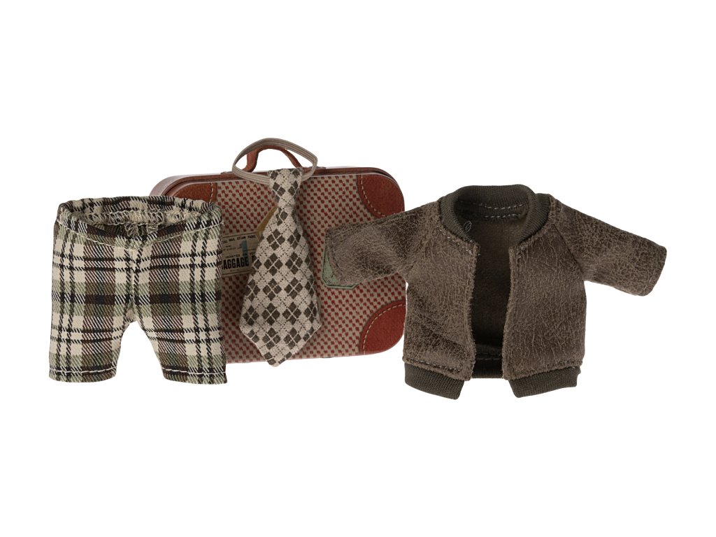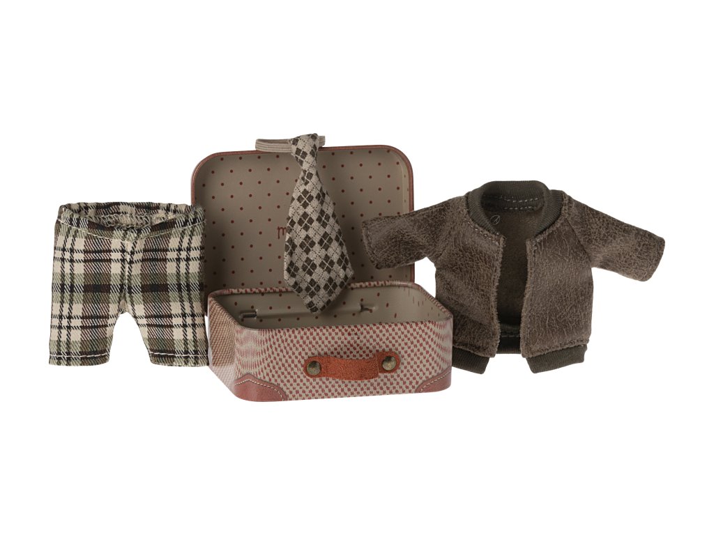 Sada obsahuje kufřík, kalhoty, kravatu, koženou bundu. Děda nebo taťka bude štramák, už má sbaleno třeba na dovolenou.