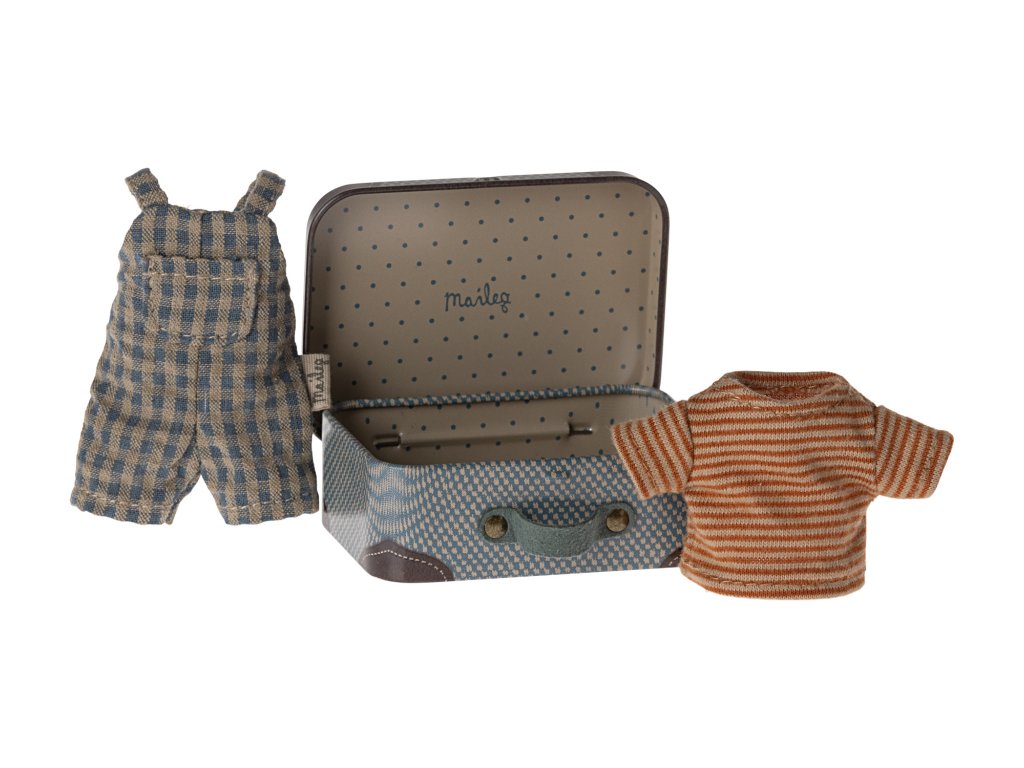 Sada obsahuje kufřík, tričko a laclové kalhoty.Myšák už má sbaleno třeba na dovolenou.