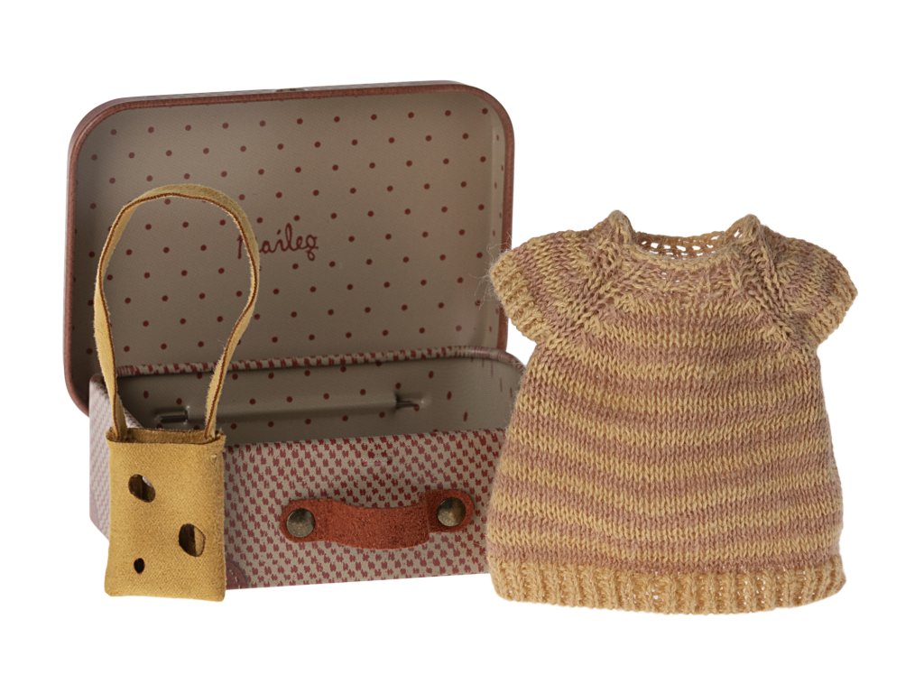 Sada obsahuje kufřík, šaty a sýrovou kabelku.Myška už má sbaleno třeba na dovolenou.