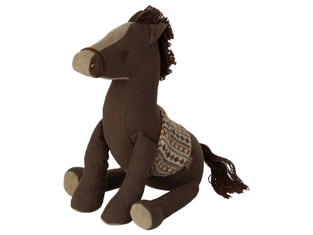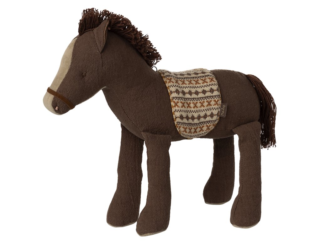 Nyní můžete mít svého vlastního Maileg poníka, kterého budete milovat a starat se o něj. Poník je vyroben z hnědého manšestru, s černým ocasem a hřívou. Poník má krásné pletené sedlo v klasickém Maileg designu.
