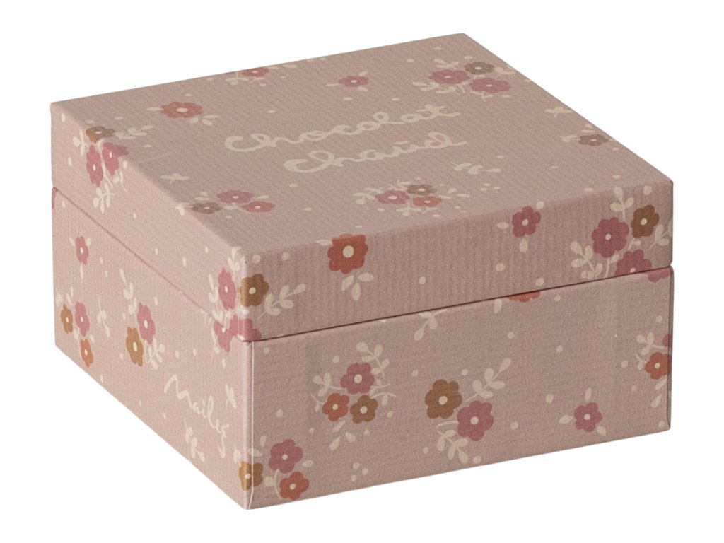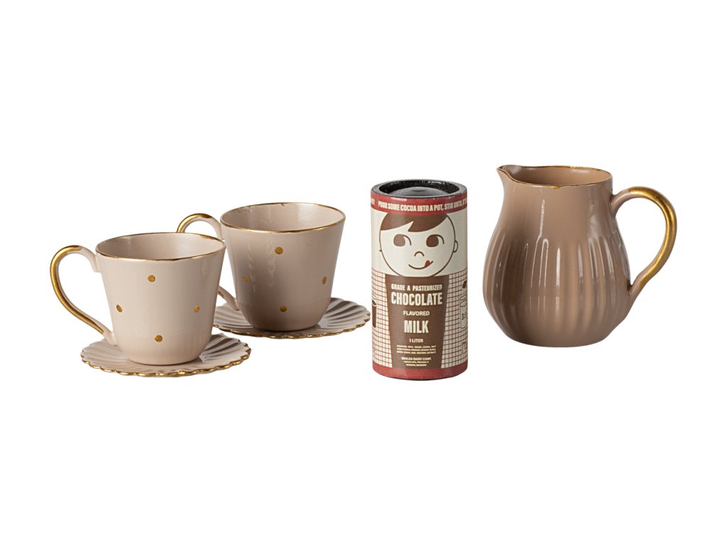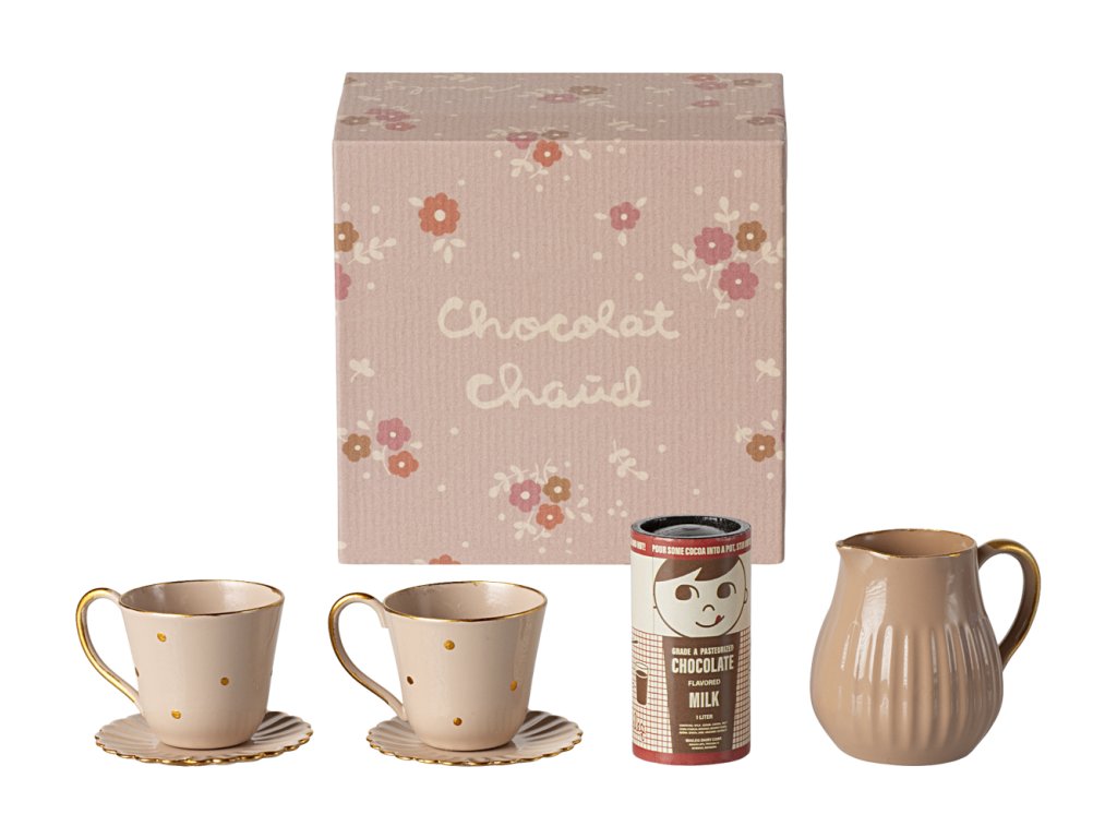 Krabička obsahuje hrnečky s podšálkem, tubu s horkou čokoládou a konvičku.