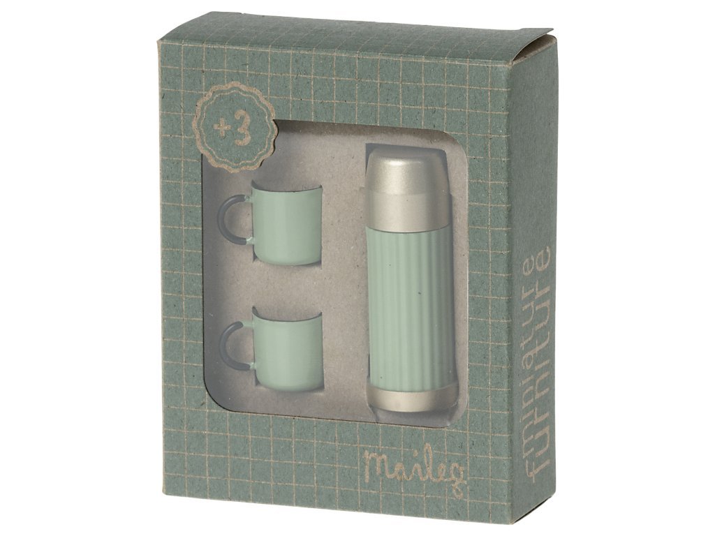 Krabička obsahuje 2 plechové hrnečky a termosku, která se hodí třeba na myší piknik nebo výlet do přírody.