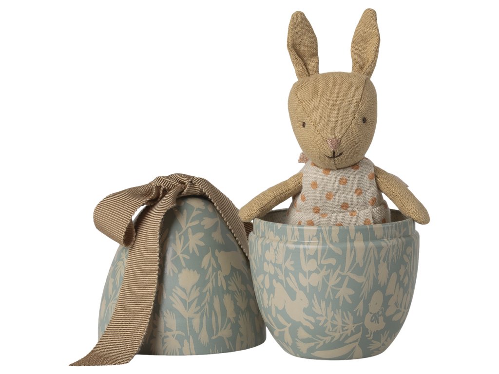 Uvnitř tohoto kovového vajíčka s krásným potiskem a velkou měkkou mašlí nahoře najdete malého měkkého králíčka oblečeného v puntíkovaném oblečku.