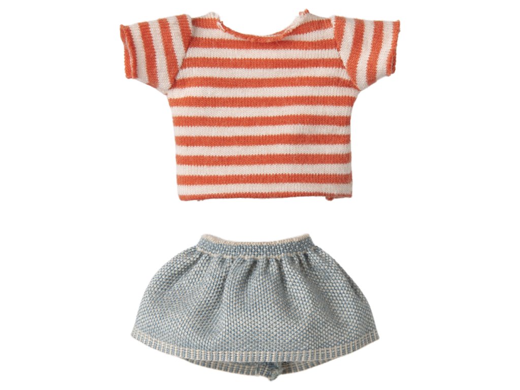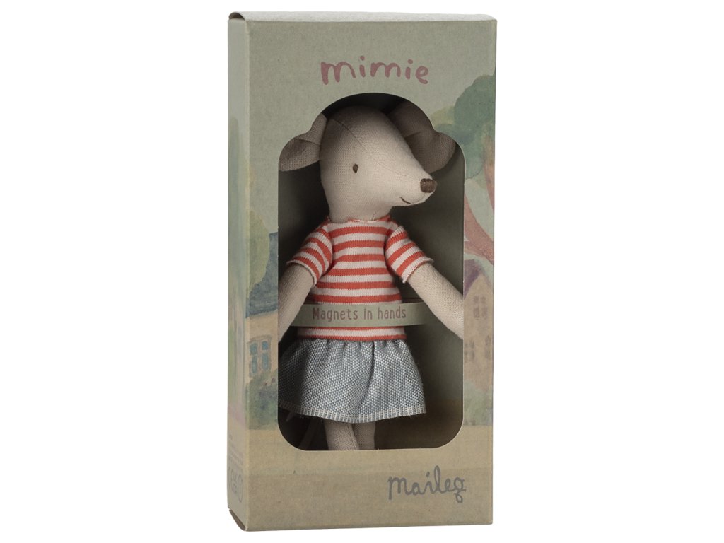 Na sobě má prouhaté tričko a džínou sukýnku a v rukou má magnety, takže může jezdit na koloběžce, nebo na tříkolce.