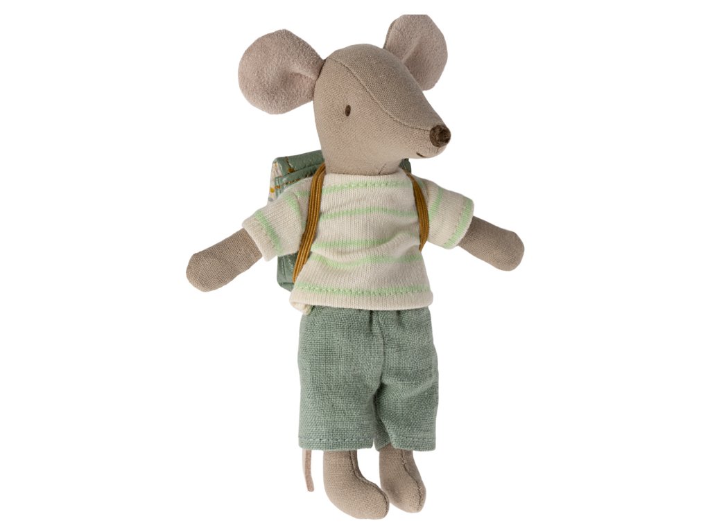 Myšák Big Brother je oblečený na den ve školce nebo ve škole a na zádech má svůj batoh.