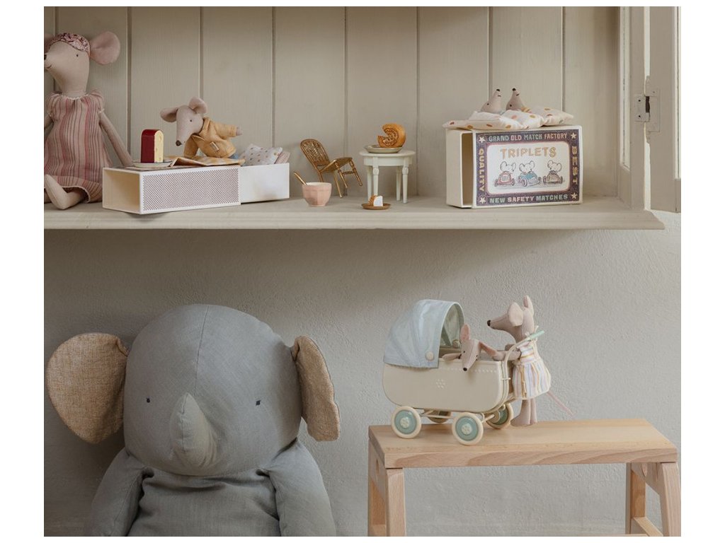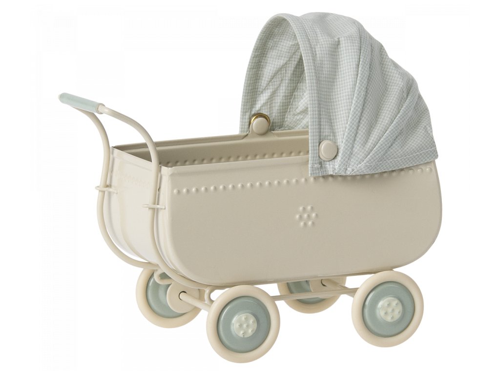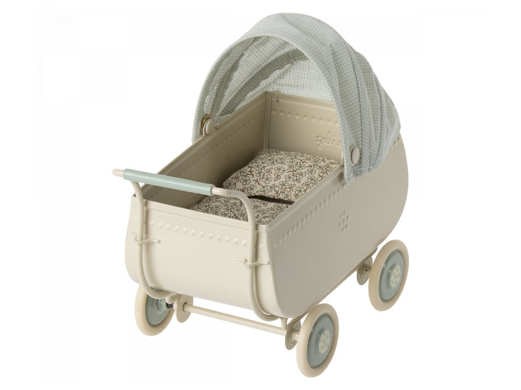 Krásný kočárek pro myšky a zajíčky od značky Maileg s exkluzivním vintage vzhledem. Kovová část má na bocích vyražené detaily. S látkovou stříškou. Měkké povlečení je ideální pro zdřímnutí. Tento unikátní produkt je částečně ručně vyráběný, proto může docházet k odchylkám.