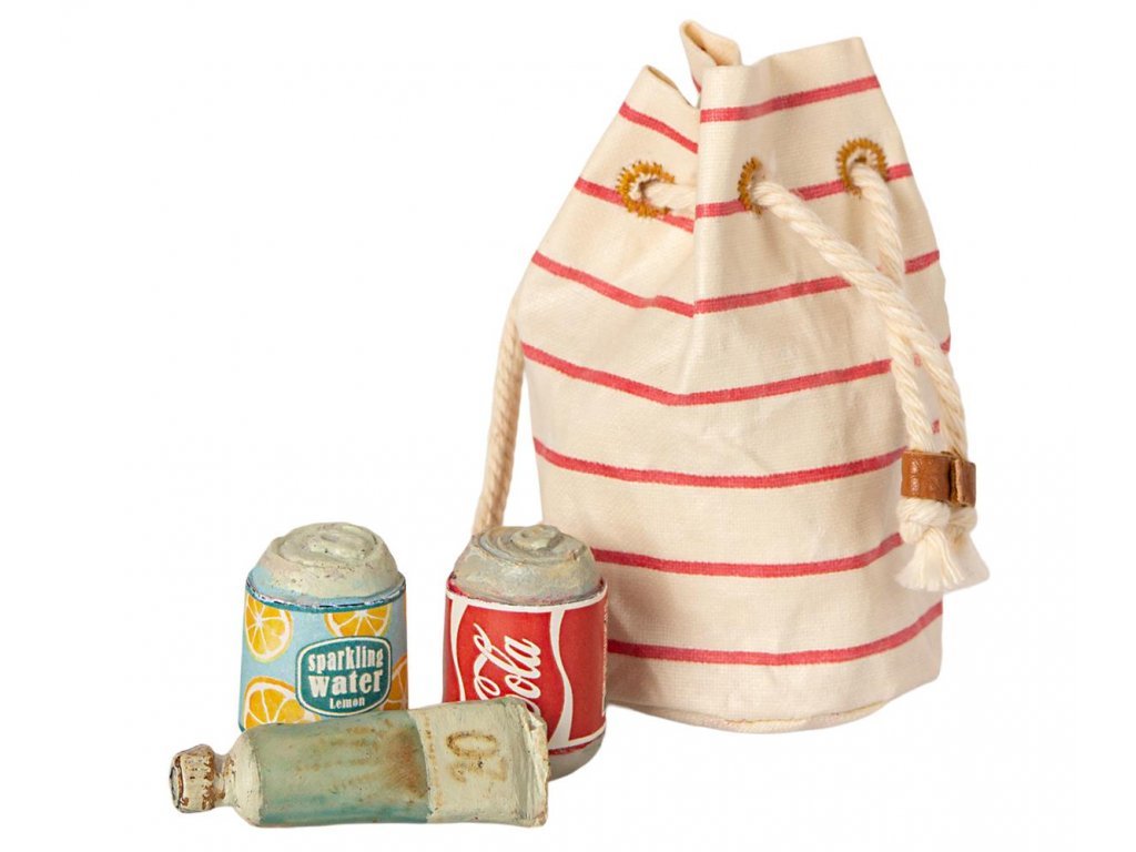 Bavlněná plážová taška se dvěma limonádami a opalovacím krémem.
