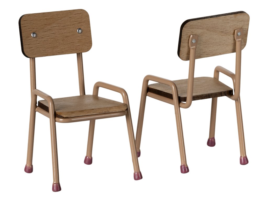 Stůl s dvěmi židlemi, vyrobený z kovu a dřeva.