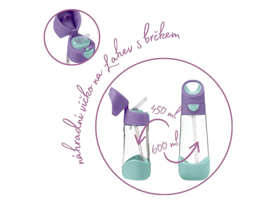 Náhradní víčko je vhodné na základnu lahve na pití s brčkem značky b.box a je plně kompatibilní pro malou lahvičkou o objemu 450 ml nebo větší o objemu 600 ml. Víčko je plně kompatibilní i se základnou lahve se savičkou sport.