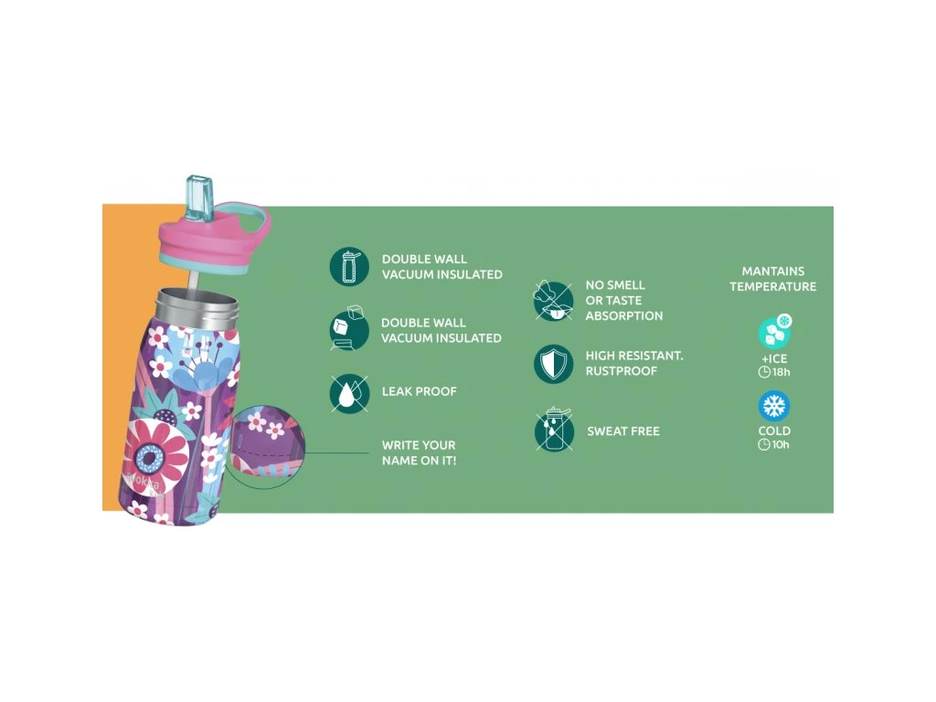 Dětská termoláhev Quokka Pop Kids z vysoce kvalitní dvoustěnné oceli udrží nápoj i během horkých letních dní příjemně studený. Láhev s pítkem a brčkem umožňuje snadné pití bez nutnosti naklánění láhve. Zaklapávací pítko brání vylití obsahu láhve. Široké hrdlo umožňuje vložení kostek ledu a zároveň se díky němu láhev snadno čistí. Údržbu usnadňuje i odnímatelné široké brčko. Díky držadlu se láhev snadno přenáší. Termoláhev udrží teplotu studeného nápoje až 10 hodin, při vložení kostek ledu až 18 hodin. Na spodní části láhve je prostor pro napsání jména nebo nakreslení obrázku, aby nedošlo k záměně ve školce či ve škole. Objem: 445 ml Rozměry: 184 x 72 mm Nerezový materiál neabsorbuje pachy a neobsahuje BPA. Termoláhev není vhodná do myčky ani mikrovlnné trouby.
