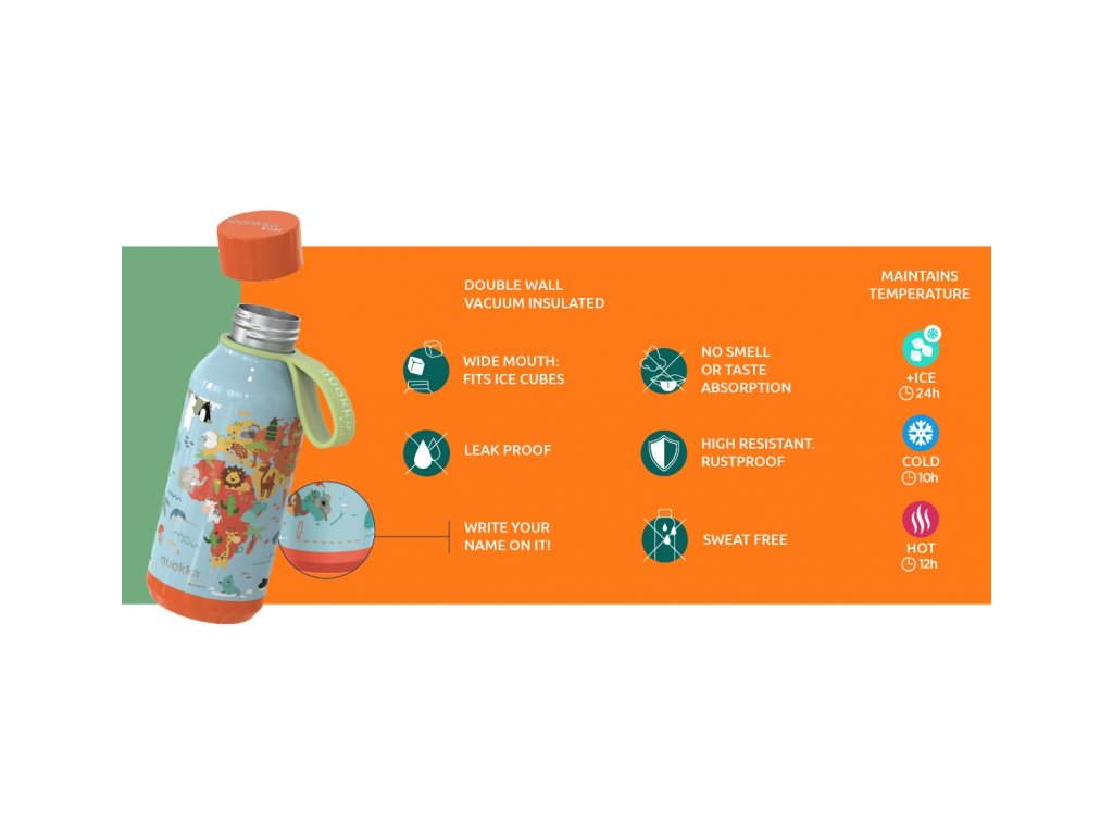 Dětská termoska Quokka Solid Kids z vysoce kvalitní dvoustěnné oceli se spolehlivým, 100% těsnicím uzávěrem udrží nápoj dle potřeby teplý či studený. Široké hrdlo umožňuje vložení kostek ledu. Termoska udrží teplotu studeného nápoje s ledem až 24 hodin, studeného nápoje až 10 hodin a teplého nápoje až 12 hodin. Termoláhev je vybavena poutkem pro snadné přenášení. Na spodní části láhve je prostor pro napsání jména nebo nakreslení obrázku, aby nedošlo k záměně ve školce či ve škole. Objem: 330 ml Rozměry: 177 x 68,5 mm Nerezový materiál neabsorbuje pachy a neobsahuje BPA. Termoska není vhodná do myčky ani mikrovlnné trouby.
