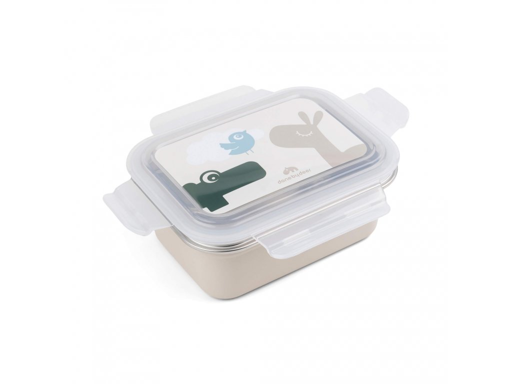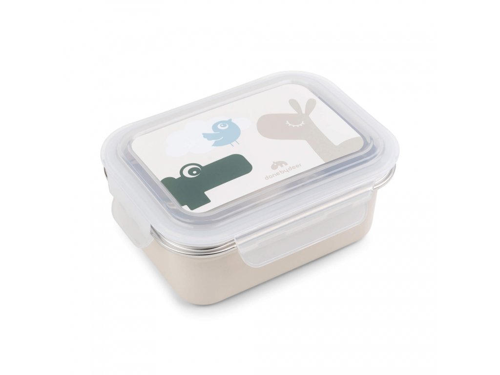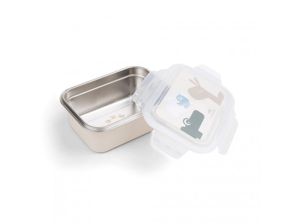 Kovový obědový box s Croco a Lalee Vám nesmí chybět na cestách! Nerezová krabička je ideální pro oběd Vašich nejmenších a plastové víko ji parádně utěsní. Obědový box je vyroben z kvalitní oceli - nerezové oceli 18/8 - díky čemuž je velmi odolný a má dlouhou životnost. Uvnitř krabičky nejsou žádné potisky, krabička neuvolňuje žádnou chuť, vůni ani chemikálie. Praktický kovový obědový box je v pískově béžovém tónu. Víko zdobí jelení přátelé Croco, Lalee a Birdee v jemných odstínech zelené, pískové a modré.