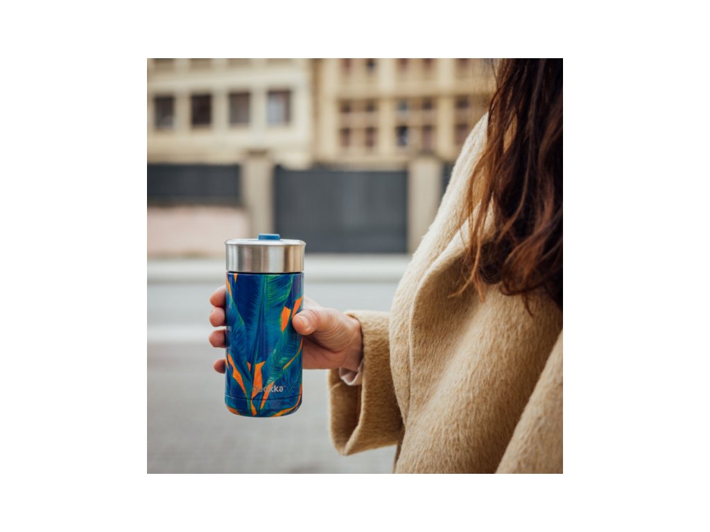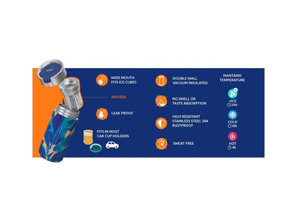 Termohrnek Quokka Boost z vysoce kvalitní dvoustěnné oceli se spolehlivým, 100% těsnicím uzávěrem udrží váš nápoj dle potřeby teplý či studený. Termohrnek udrží teplotu studeného nápoje s ledem až 24 hodin, studeného nápoje až 10 hodin a teplého nápoje až 4 hodiny. Součástí termohrnku je vyjímatelné sítko, vhodné např. na sypaný čaj. Široké hrdlo umožňuje vložení kostek ledu. Víčko se zaklapávacím uzávěrem umožňuje snadné pití přímo z hrnku. Objem: 400 ml Rozměry: 167 x 74 mm Nerezový materiál neabsorbuje pachy a neobsahuje BPA. Termohrnek není vhodný do myčky ani mikrovlnné trouby.
