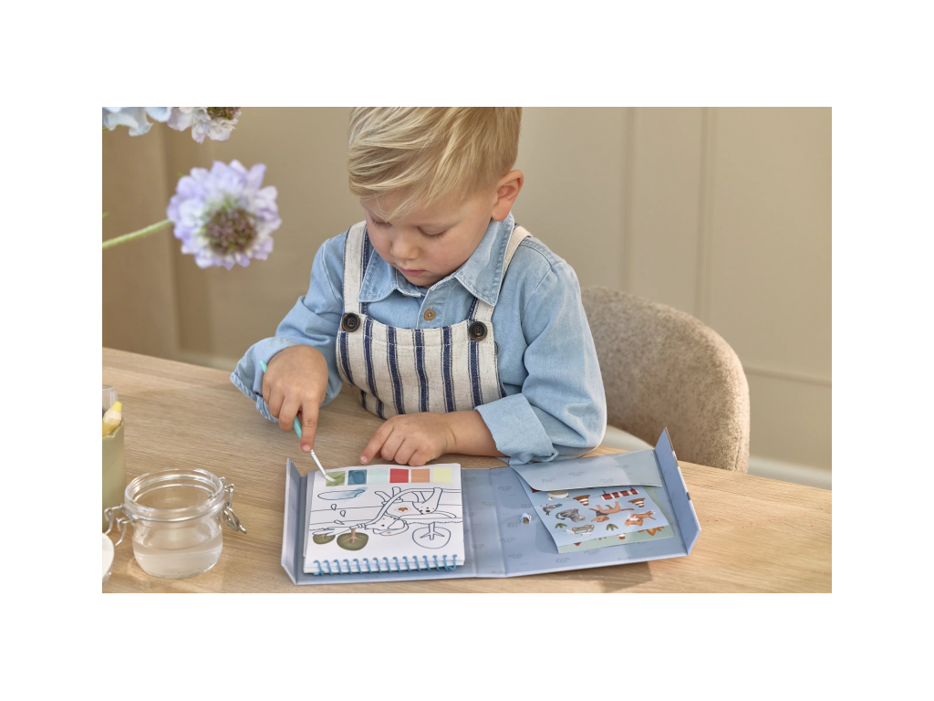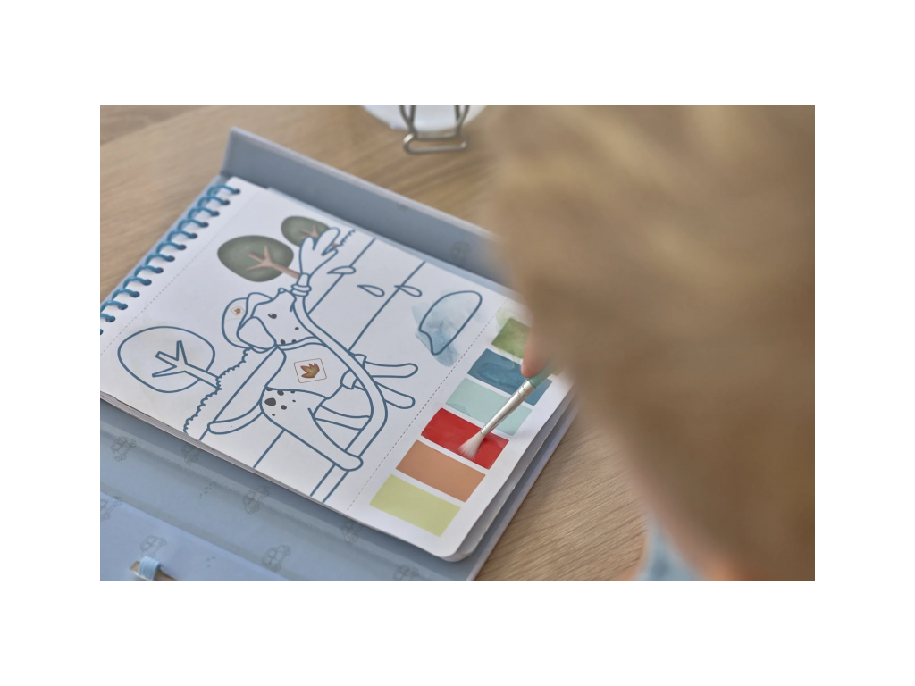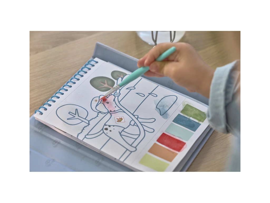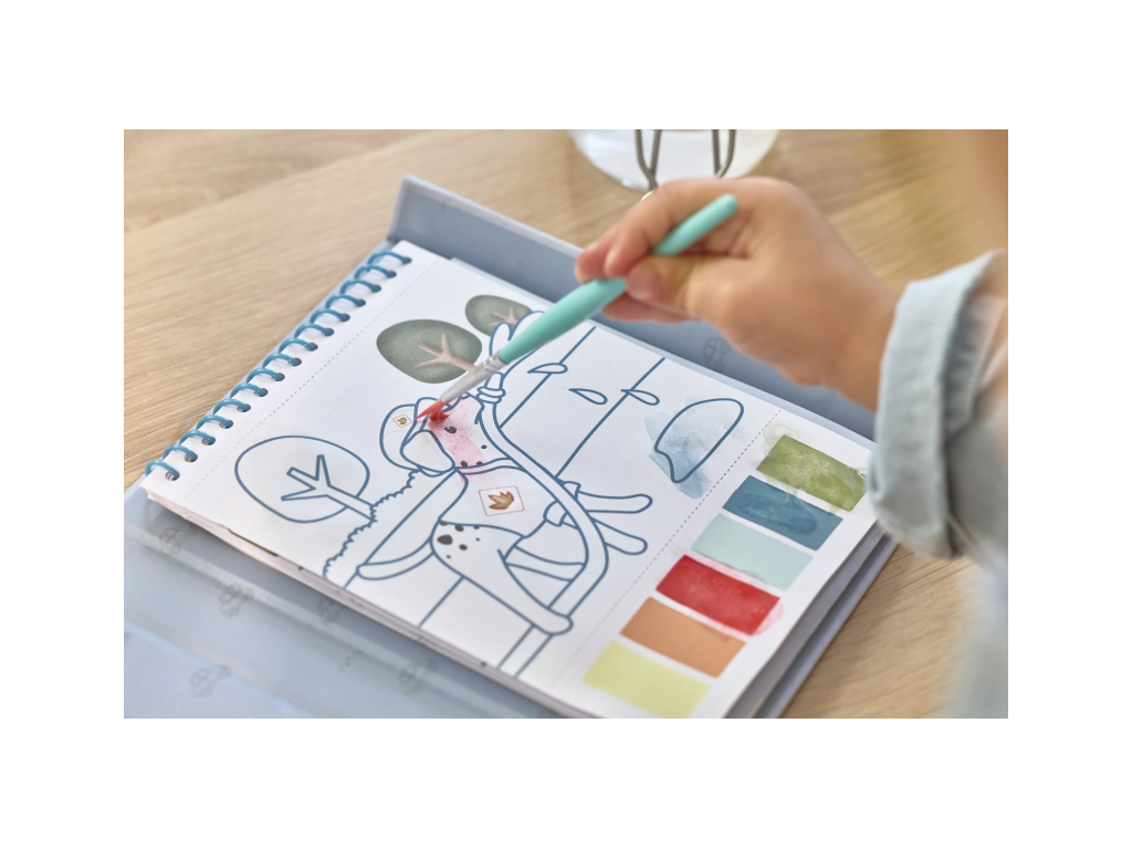 Každá stránka nabízí vlastní paletu akvarelových barev pro vybarvování štětcem, takže použití je velmi jednoduché.