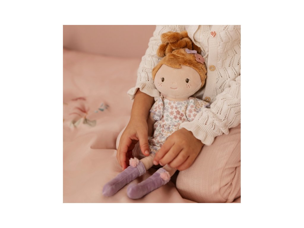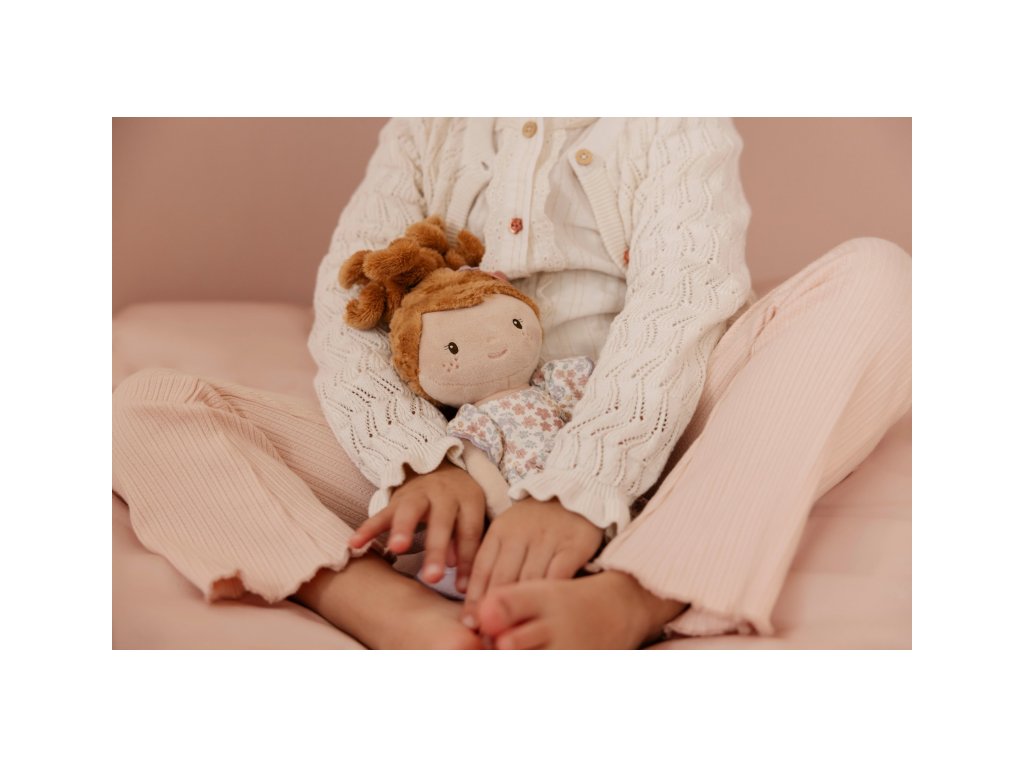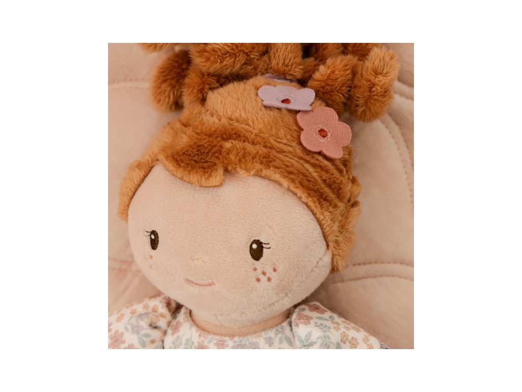 Něžná plyšová panenka Ava z měkkého jemného materiálu je oblečená do krásných květovaných šatiček.