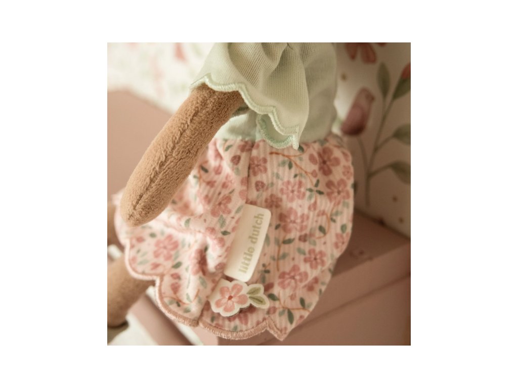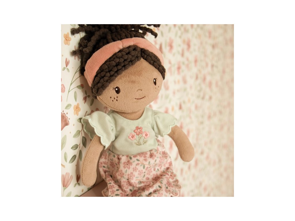 Něžná plyšová panenka Evi z měkkého jemného materiálu je oblečená do krásných květovaných šatiček.