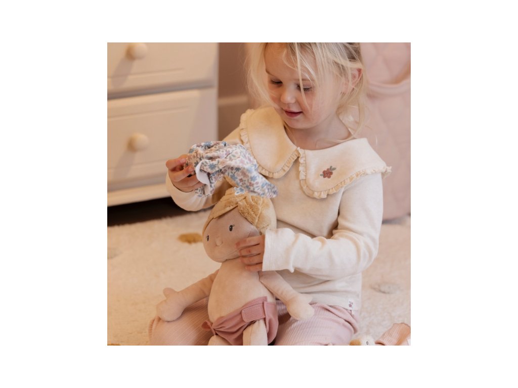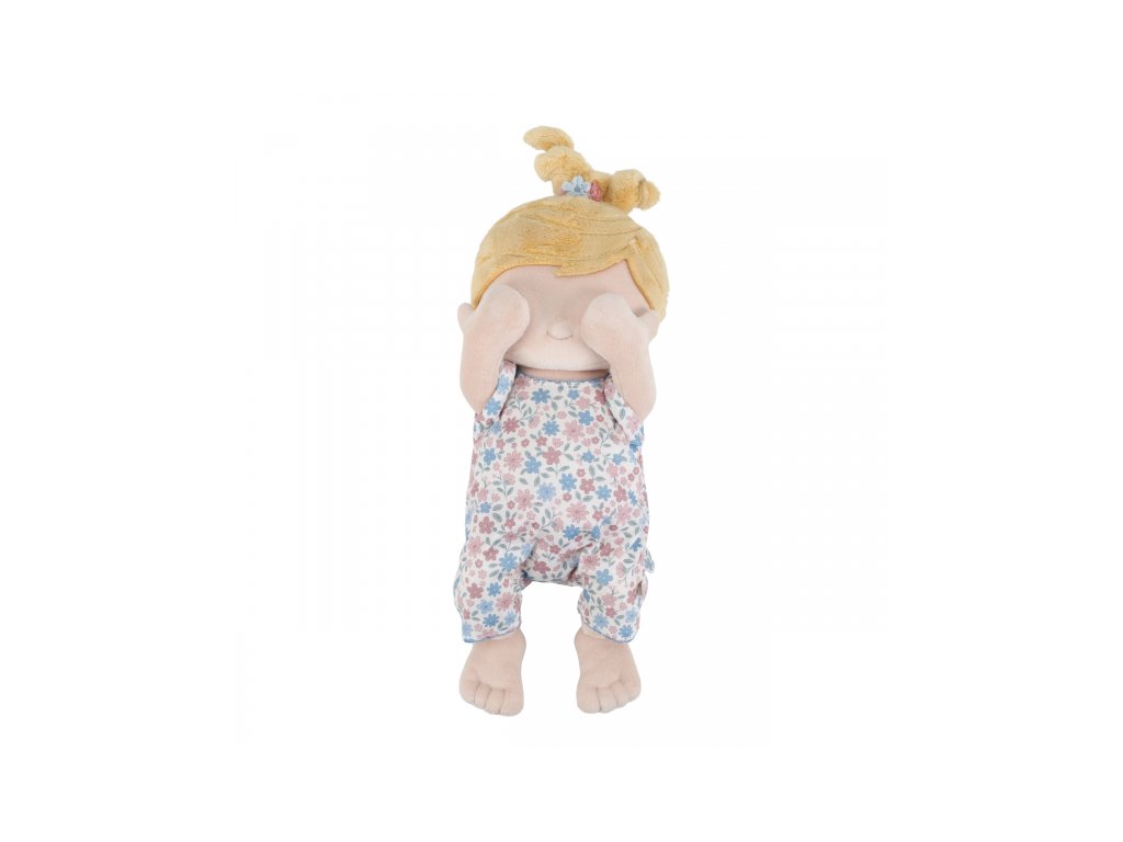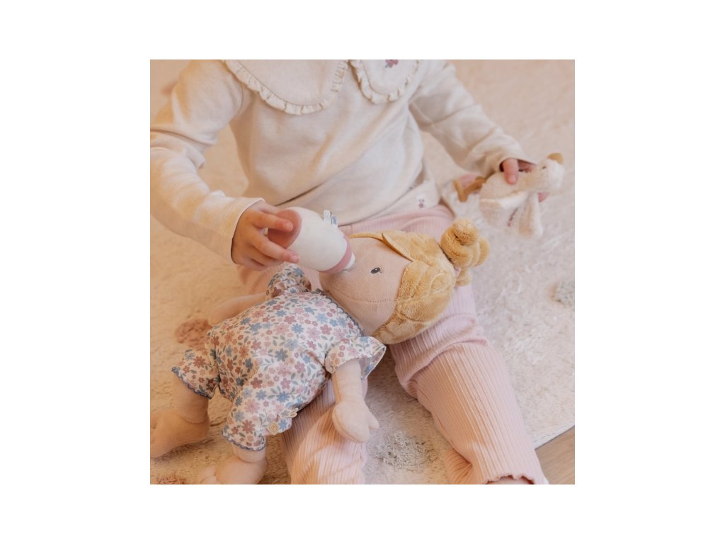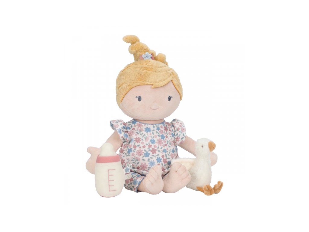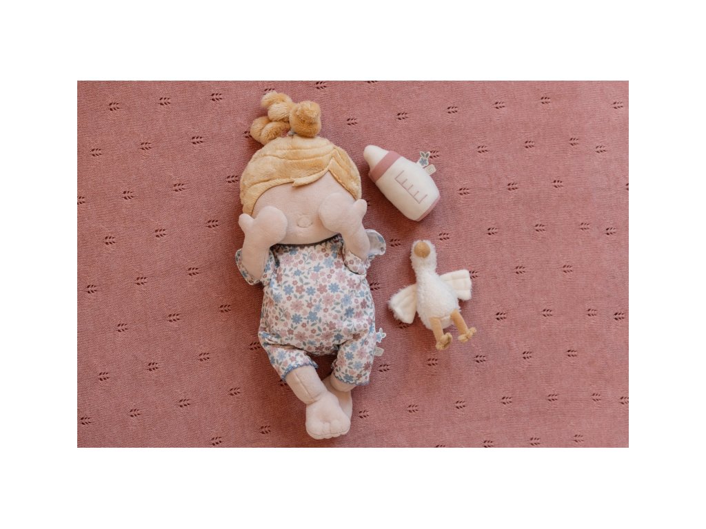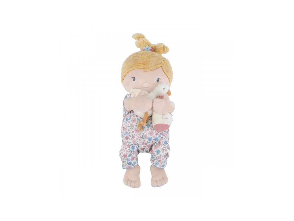 Něžná plyšová panenka Julia z měkkého jemného materiálu je připravena na spaní, oblečena do pyžámka, vybavená lahvičkou a plyšovou hračkou.