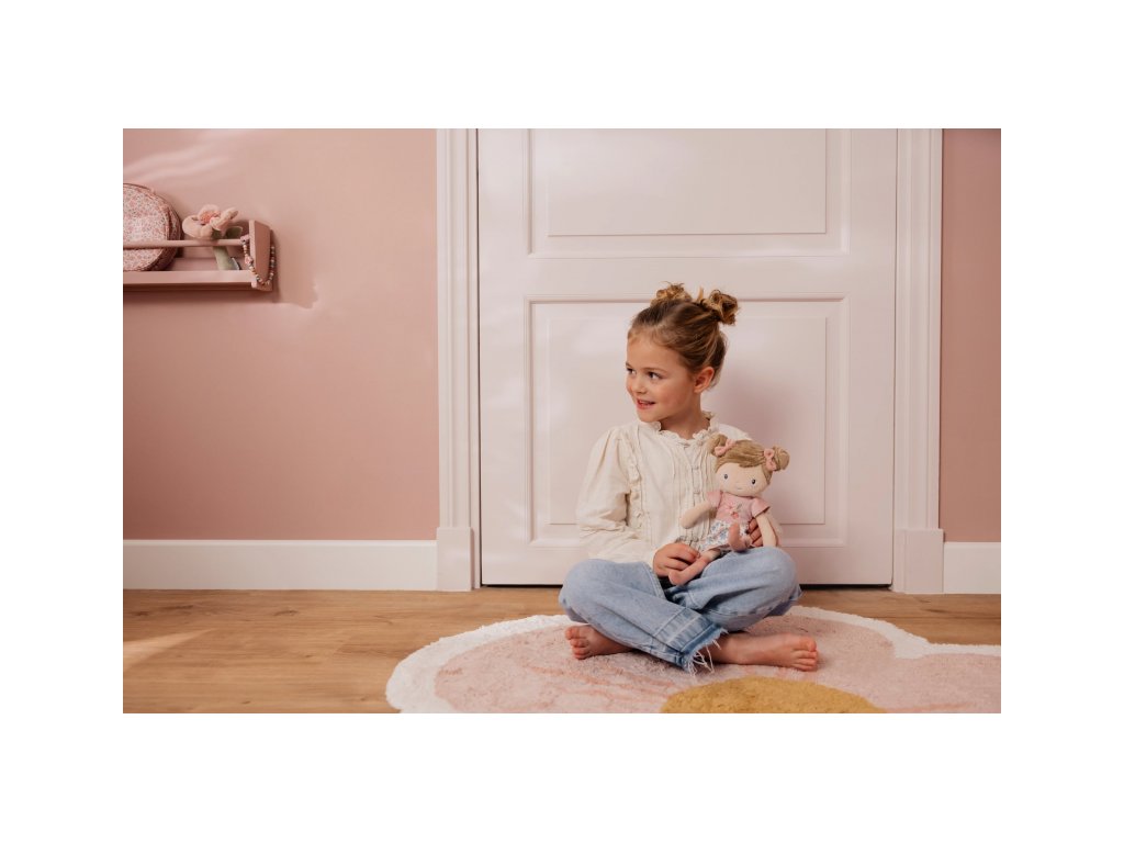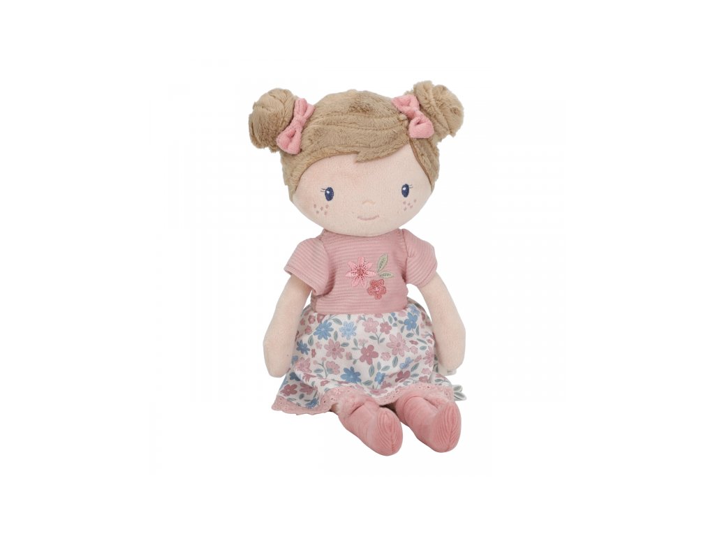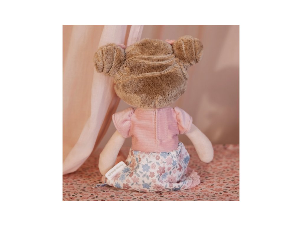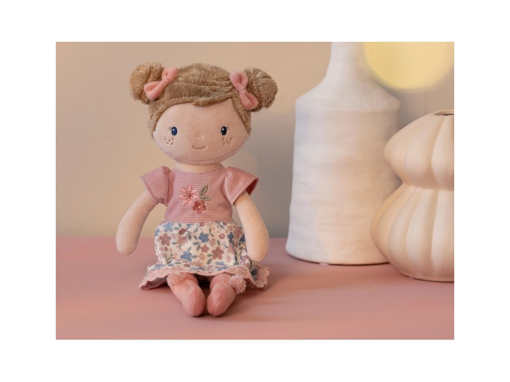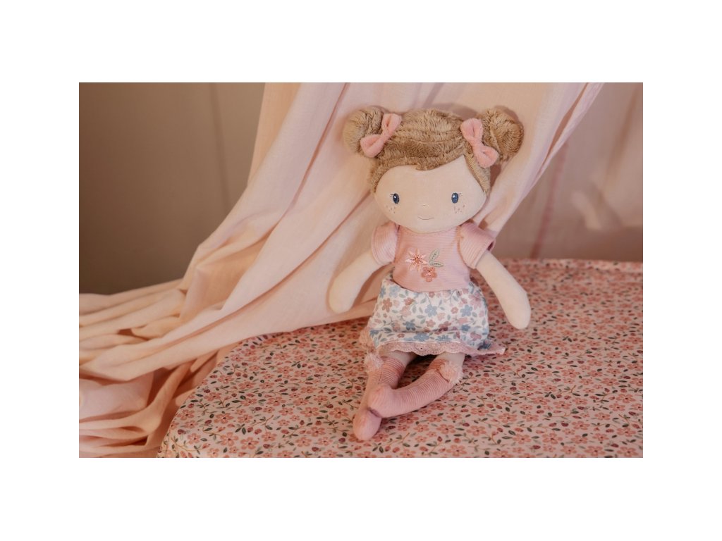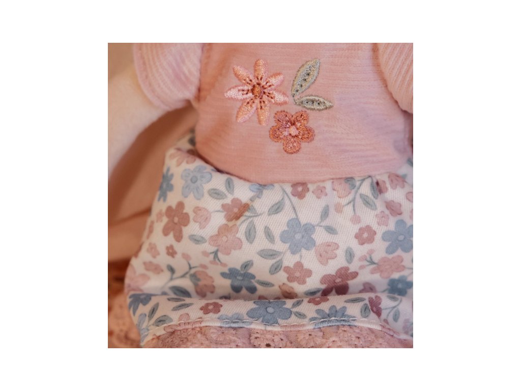Něžná plyšová panenka Rosa z měkkého jemného materiálu je oblečená do krásných květovaných šatiček.
