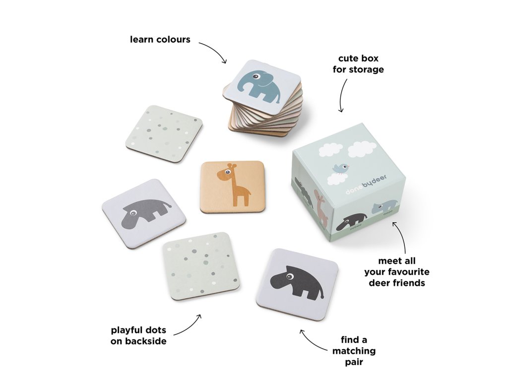 Pexeso se 16 kartami. Kartonové karty s potisky Deer friends. Zábavné barvy pro vizuální stimulaci. Rozvíjejte paměť, koncentraci a kognitivní dovednosti svého dítěte. Zábavný způsob, jak strávit kvalitní čas se svým batoletem. Učí vaše dítě zpracovávat své emoce spojené s výhrou a prohrou. Pomocí karet můžete mluvit a učit se o jeleních přátelích.