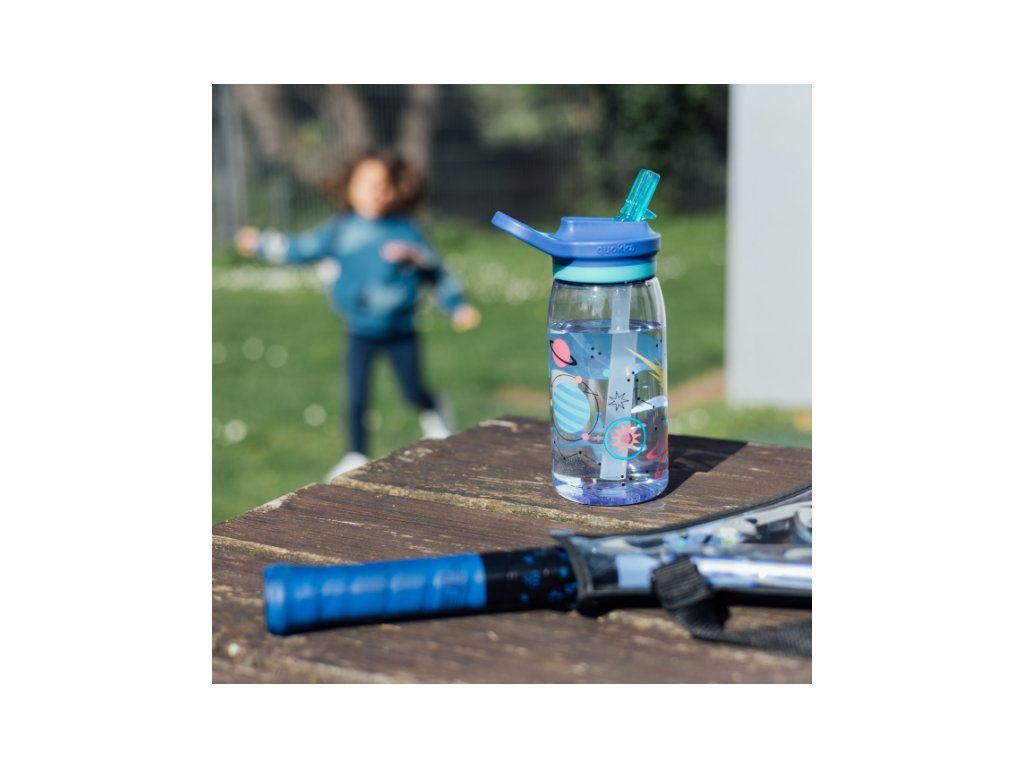 Dětská láhev Quokka Glow Kids s pítkem a brčkem umožňuje snadné pití bez nutnosti naklánění láhve.
