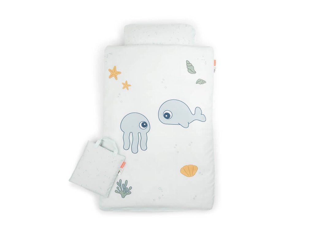 Dětské povlečení Jelly & Wally z organické bavlny s certifikací GOTS je na pokožce Vašeho dítěte měkké a pohodlné. Vytvořte si útulné prostředí na spaní s hravým potiskem Jelly & Wally a nechte své děťátko ponořit se do klidných snů oceánu. Dětské povlečení Jelly & Wally má praktický bezpečnostní YKK zip v povlaku na polštář i v povlaku na peřinu. Je zabaleno v malé bavlněné taštičce, která se hodí k dětskému povlečení. Malá taška je ideální na hračky, oblečení nebo jiné praktické účely. Ložní prádlo má celkový pudrový tón s prvky oceánského života, jako jsou mušle, korálový útes, mořské hvězdy a dva mořští přátelé Jelly a Wally v jemných tónech. Zadní stranu zdobí roztomilý bublinkový potisk ladící s taškou.