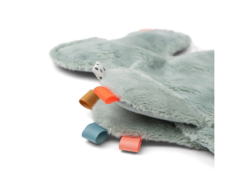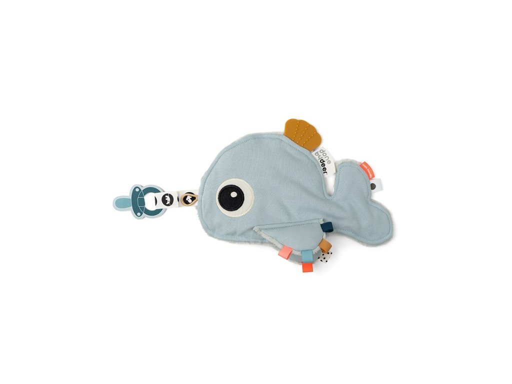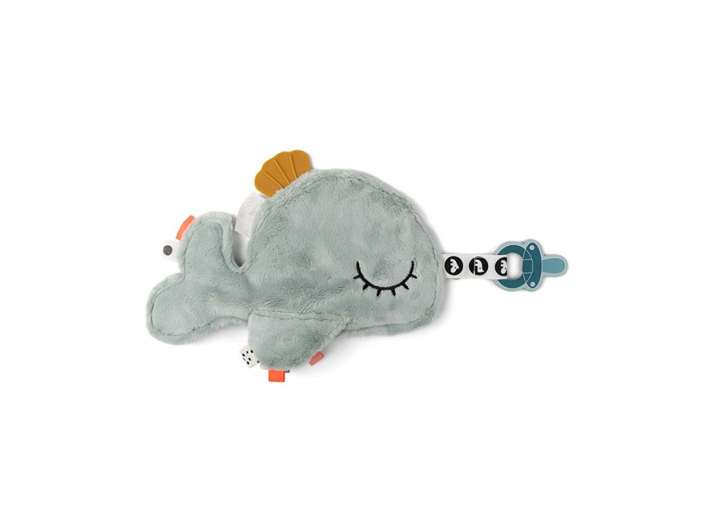 Miminka se mohou pomazlit s měkkou a ospalou velrybou. Prstíky mohou snadno uchopit měkkou ploutev a zabavit se zkoumáním barevných štítků, různých textur a tvarů. Měkké silikonové hryzátko stimuluje a uklidňuje svědění dásní. Roztomilá velryba udrží dudlíky v blízkosti, když děťátko usne. Praktické poutko na suchý zip a elastické poutko umožňuje připevnění dudlíků. Uklidňující přítel z moře je dokonalým společníkem pro vaše dítě.