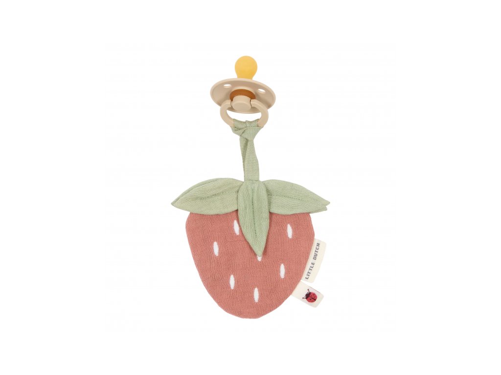 Přívěsek z jemného mušelínu v podobě jahůdky s úchytem pro šidítko láká dítě ke hraní i zkoumání a rodičům pomůže rychle najít šidítko v postýlce či kočárku.