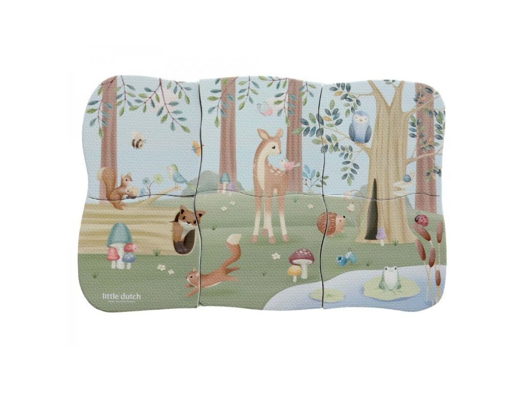 Pěnové 6-dílné puzzle do vany s natištěnými motivy ze života v lese zabaví vaše děti při koupání ve vaně. Puzzle stačí namočit a přitisknout je na vanu nebo na dlaždičky. Po koupeli je snadno uložíte do síťovinového sáčku s přísavkami, který je součástí výrobku. Hračka je součástí designové kolekce hraček a doplňků Little Dutch Forest Friends inspirované životem v lese. Vhodné pro děti od 2 let.