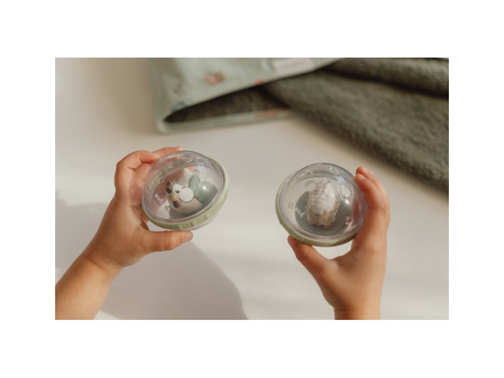 Dva průhledné míčky s pohyblivou hračkou uvnitř v podobě ovečky a slepičky jsou skvělou hračkou do koupele i na hrací deku. Míčky jsou součástí designové kolekce hraček a doplňků Little Dutch Farma. Rozměry: průměr 5,5 cm Vhodné pro děti od 4 měsíců.