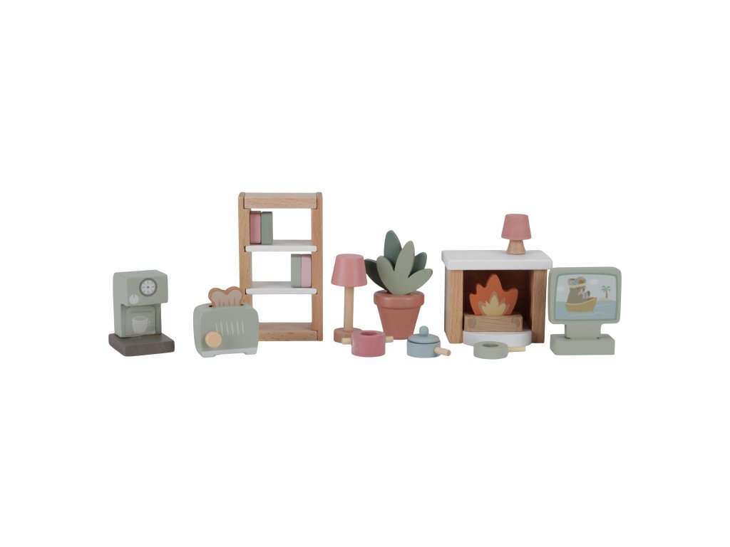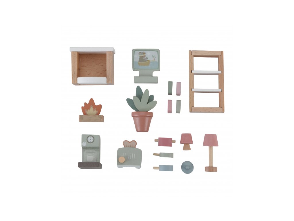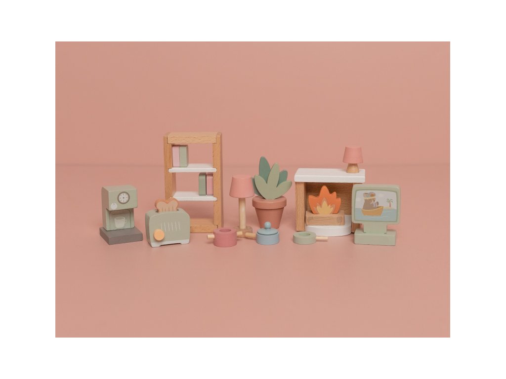 Sada doplňků do obývacího pokoje a kuchyně v krásném dřevěném provedení vhodně doplňuje vybavení dřevěného domečku pro panenky Little Dutch. Sada obsahuje knihovnu, lampičku, květinu v květináči, lampu, televizi, krb, kávovar, toastovač a sadu hrnců. Vhodné pro děti od 3 let.