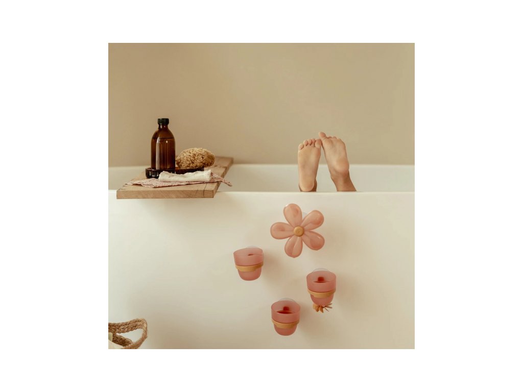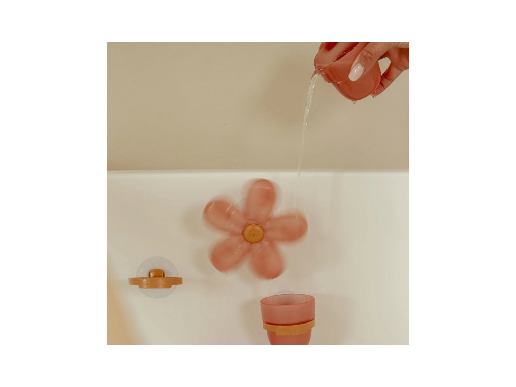 Tento hravý set obsahuje vodní mlýnek ve tvaru květiny, dva kelímky a nalévací hrneček, které lze pomocí přísavek snadno připevnit na stěnu vany nebo sprchy.