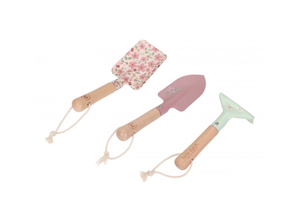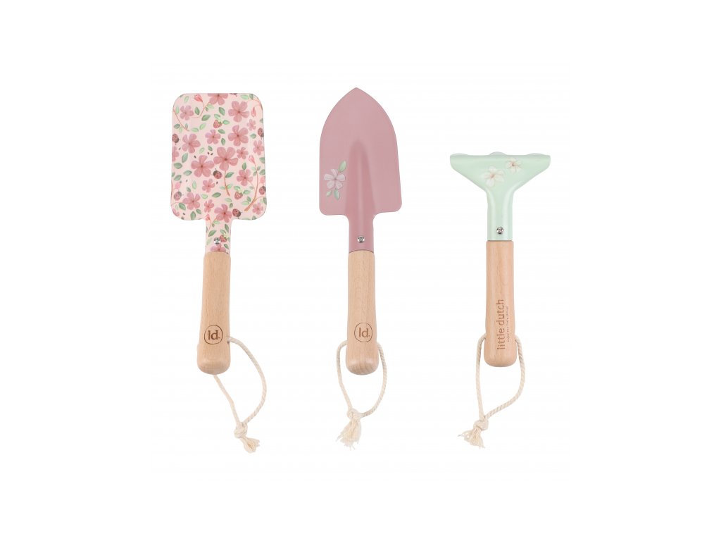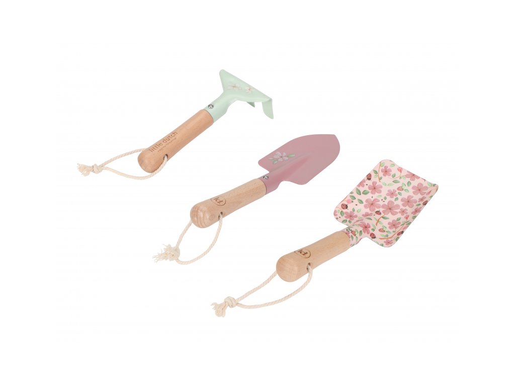Malá zahradnice či zahradník potřebuje pro své zahradničení své vlastní nářadí! Tato sada obsahuje dvě lopatky a hrabičky v kvalitním provedení z odolného kovu s dřevěnou rukojetí pro pohodlné uchopení. Nářadí je zdobené krásným potiskem, praktická poutka umožňují po skončení práce zavěšení nářadí kdekoli, kde bude připravené pro další použití. Nářadí s krásným potiskem je součástí designové kolekce hraček a doplňků Little Dutch Fairy Garden, inspirované životem na zahradě. Vhodné pro děti od 3 let.