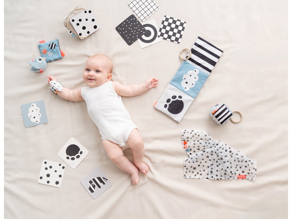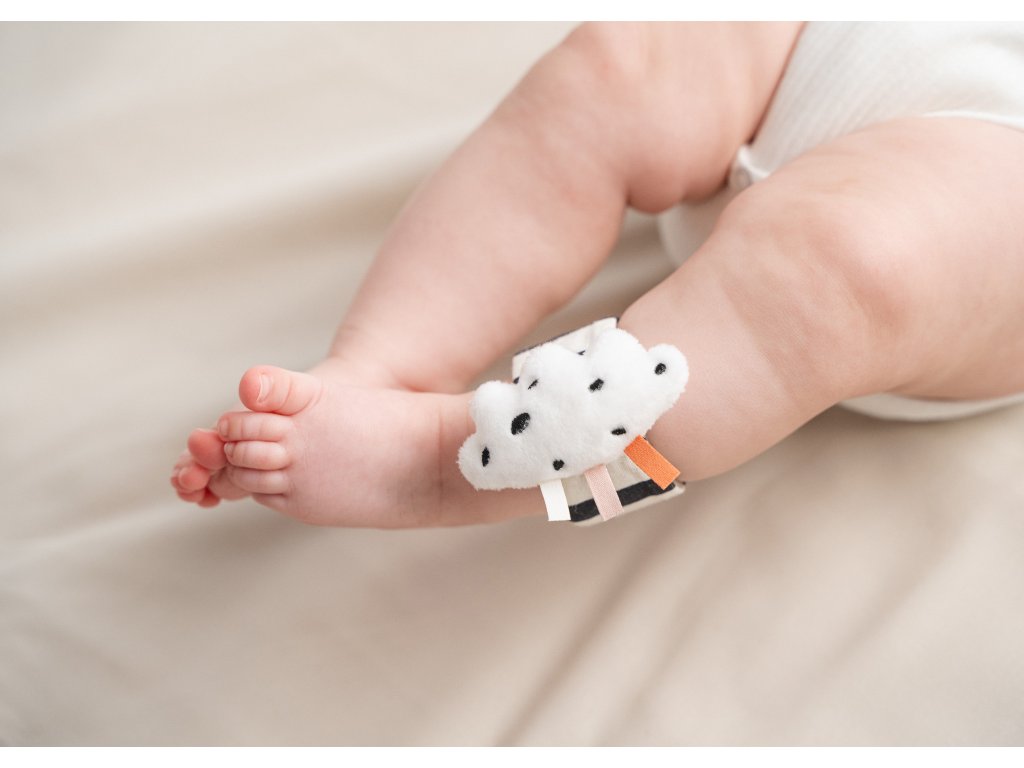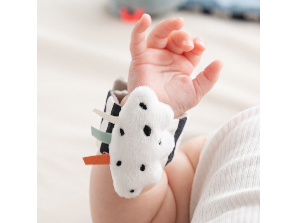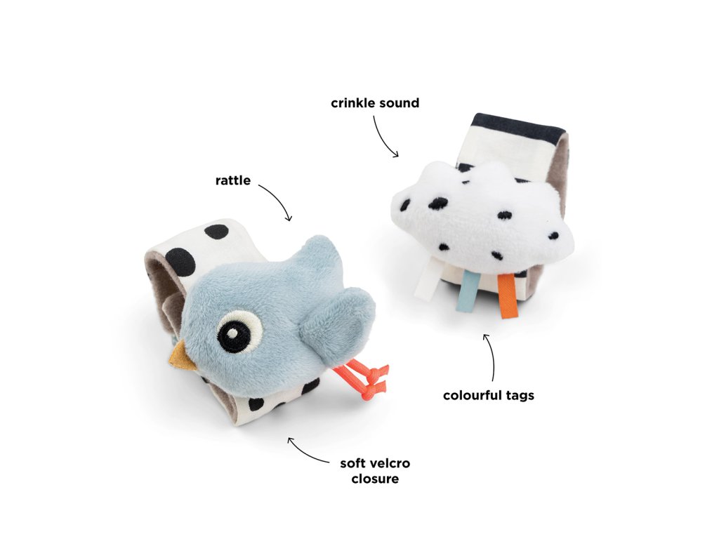 Sada chrastítek na zápěstí Happy clouds se skládá ze 2 měkkých dětských náramků s pudrovými detaily. Doporučeno od 0 měsíců. Ideální pro smyslovou stimulaci, uvědomování si těla a rozpoznávání rukou. Kontrastní tečky a pruhy a barevné prvky pro vizuální stimulaci. Drnčení a vrzání stimulují vaše dítě. Jeden náramek má tečky a Birdee, zatímco druhý má pruhy a obláček. Zapínání na suchý zip usnadňuje nasazování a vyjímání chrastítek. Lze použít jak na zápěstí, tak na kotníky.