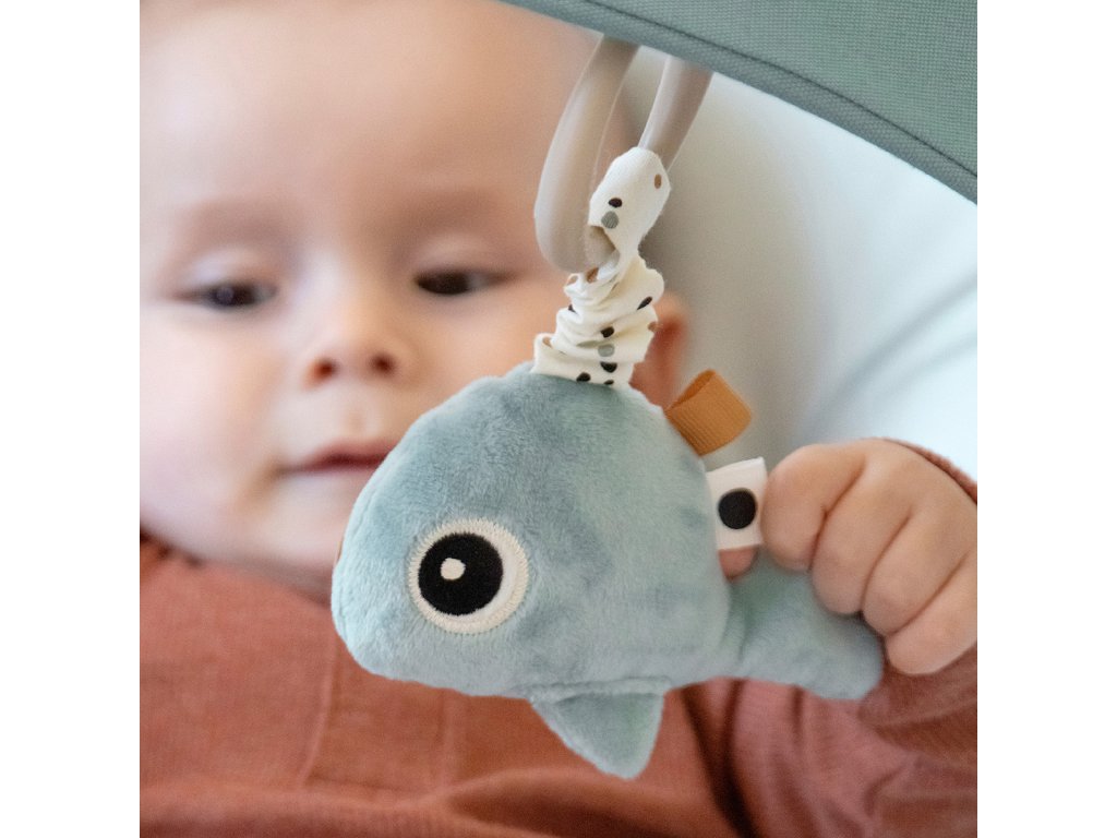 Plyšová Wally má zábavné dětské zrcátko a cool mušle má smyslové chrastítko. Obě hračky jsou vybaveny senzorickými štítky k prozkoumání a lze je snadno zavěsit pomocí praktického poutka.