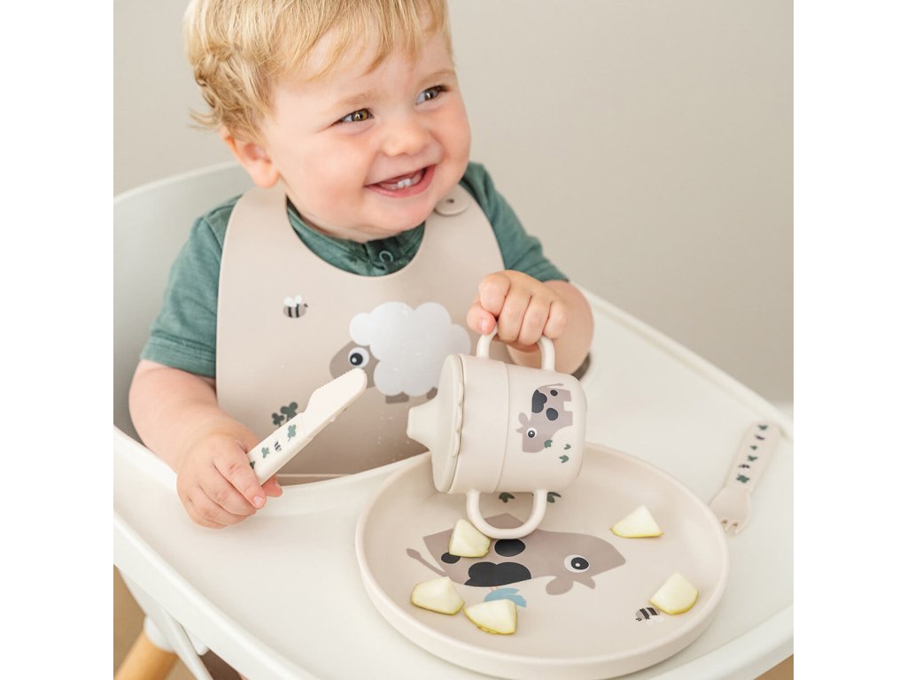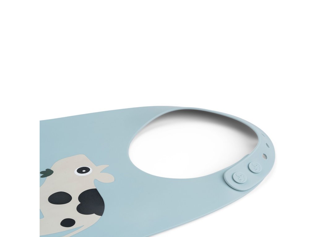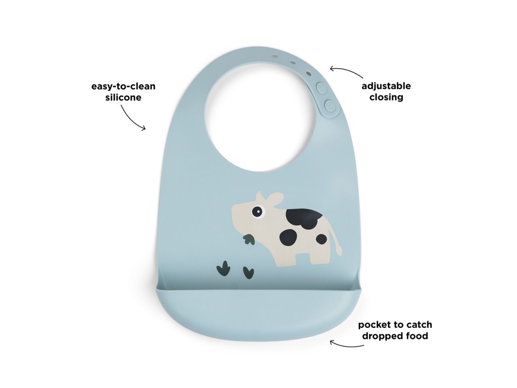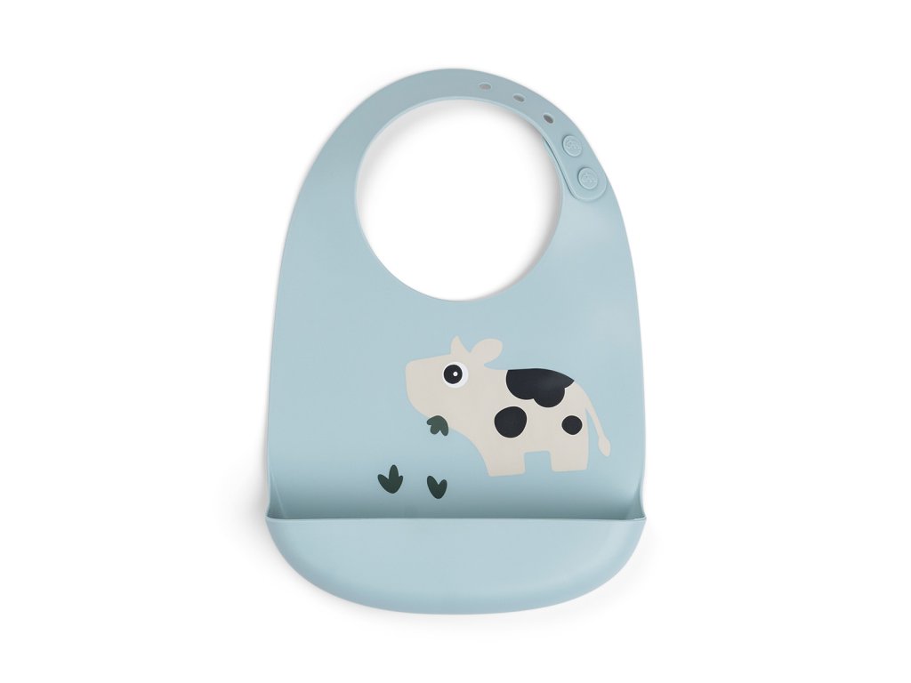 Kravička Dotti vykukuje z praktického silikonového bryndáčku - připravený zachytit každý drobeček.