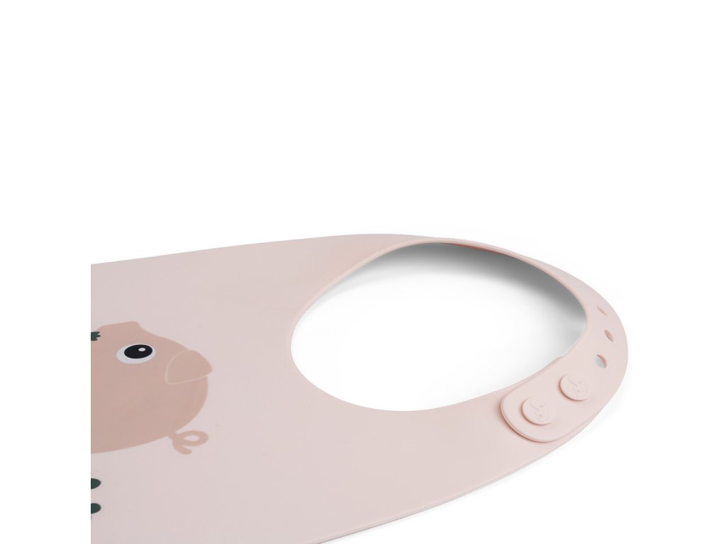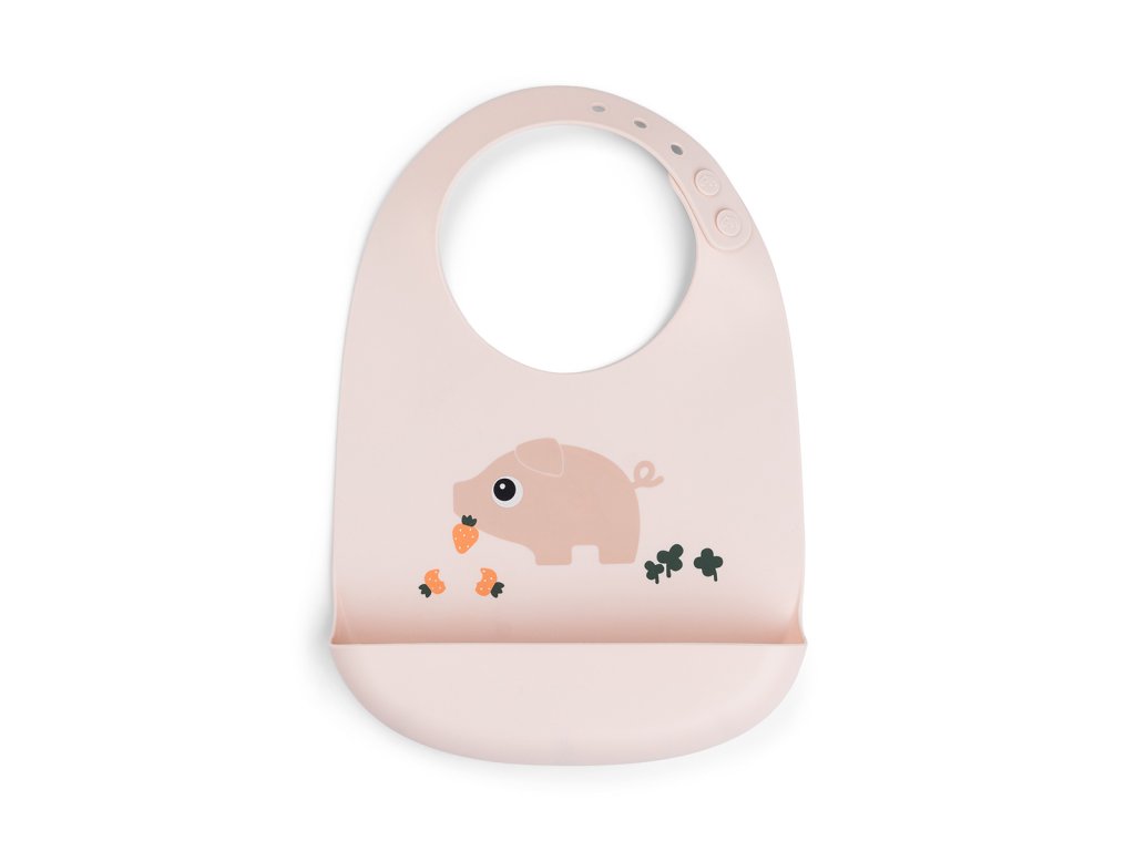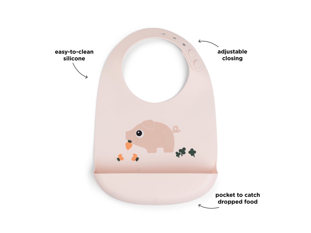 Prasátko Pigee vykukuje z praktického silikonového bryndáčku - připravený zachytit každý drobeček.