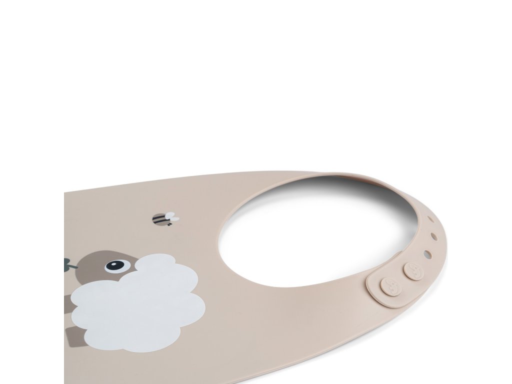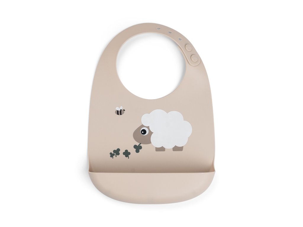 Ovečka Sheepy vykukuje z praktického silikonového bryndáčku - připravený zachytit každý drobeček.