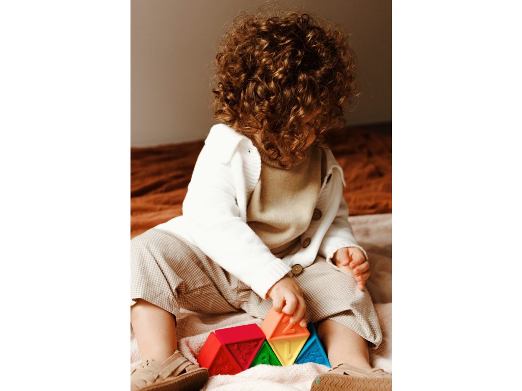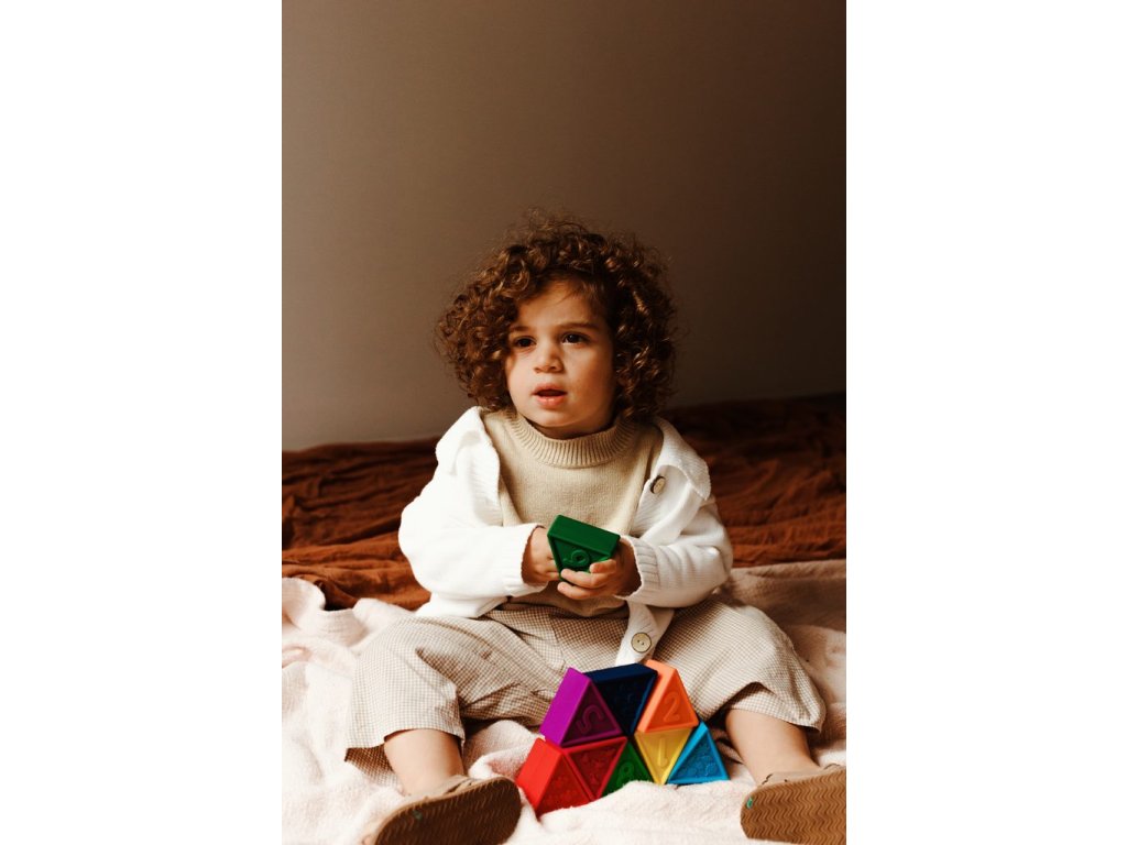 Perfektní tvar a hmotnost pro malé ručičky k prozkoumávání, seřazování, vyvažování a stohování. Bloky mají dotykové povrchy, které lze promačkávat.