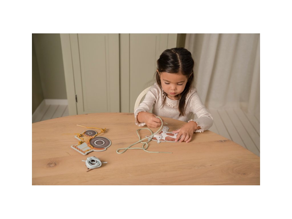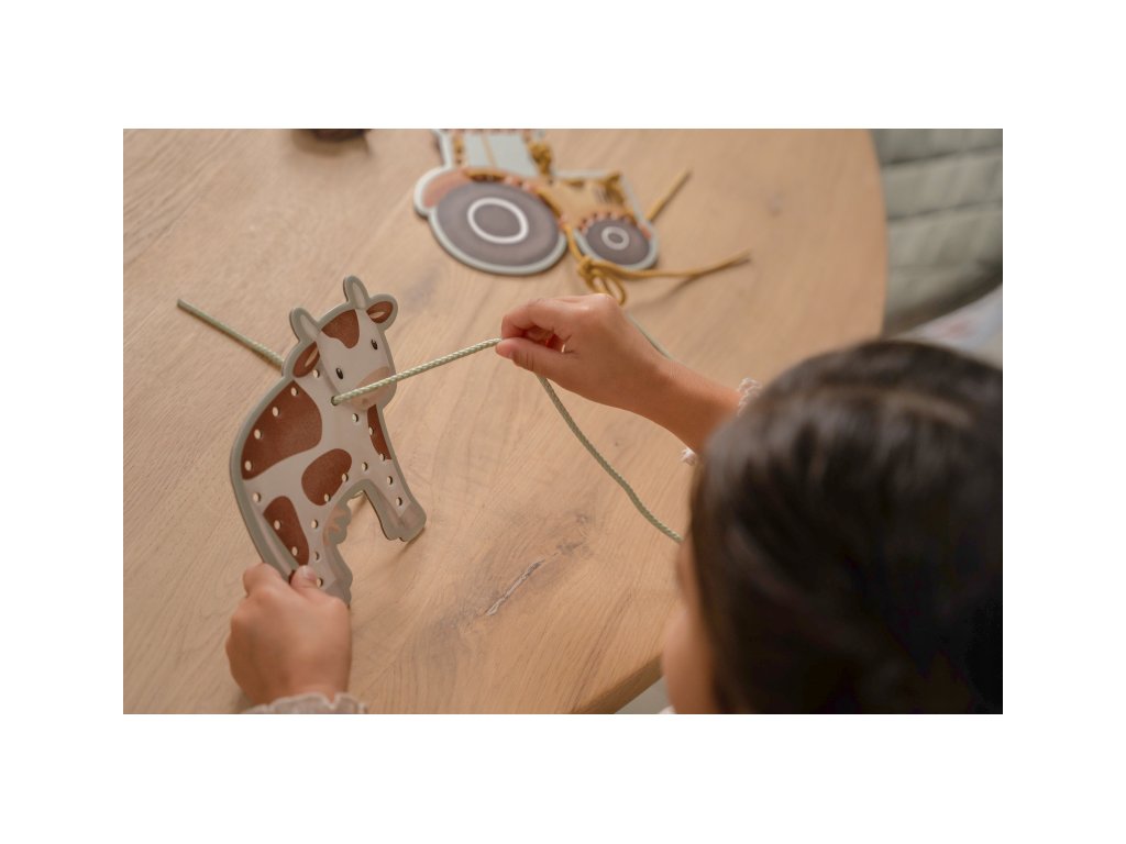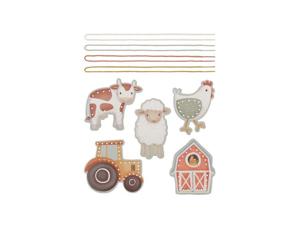 Sada pěti kartonových karet s otvory pro provlékání šňůrek je originální hračkou, která vaše dítě zabaví a zároveň podpoří jeho kreativitu i trpělivost. Karty v podobě kravičky, ovečky, slepičky, traktoru a stáje jsou vyrobené z kvalitního pevného kartonu a množství otvorů nabízí nekonečné množství způsobů provlékání šňůrky. Šňůrka v podobě tkaničky s plastovým zakončením umožňuje snadné navlékání i malým dětským ručičkám. Šněrování pomáhá rozvoji jemné motoriky a koordinace ruka / oko dítěte. Hračka je součástí designové kolekce hraček a doplňků Little Dutch Farma. Balení obsahuje 5 kartonových karet s otvory a 4 šňůrky. Vhodné pro děti od 3 let.