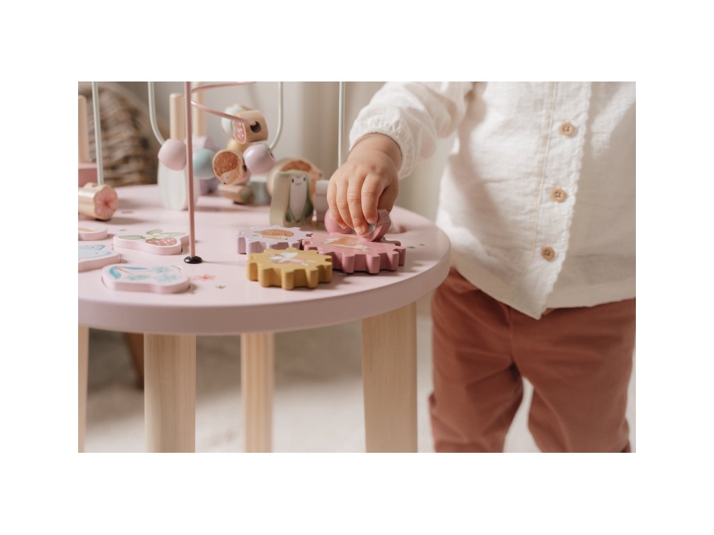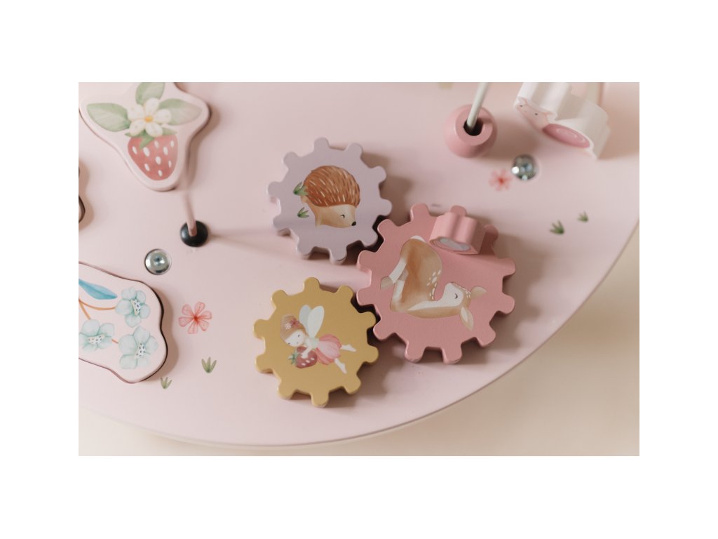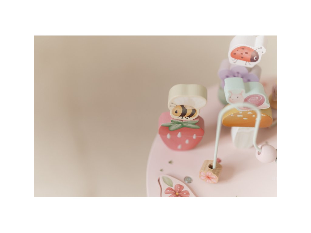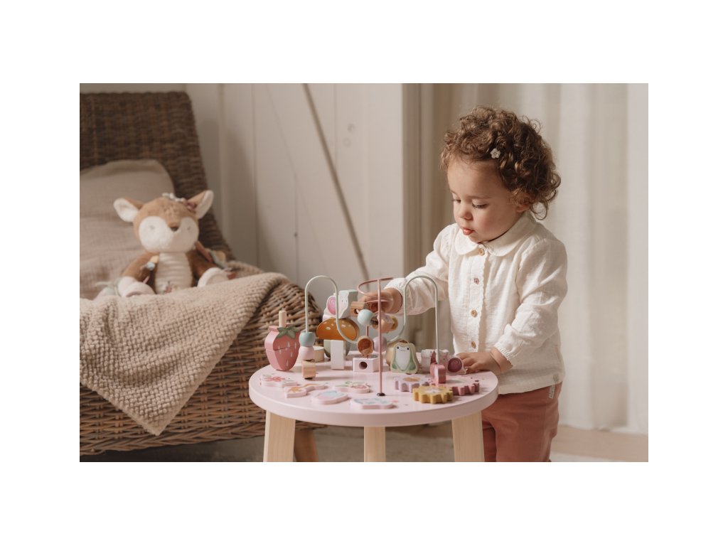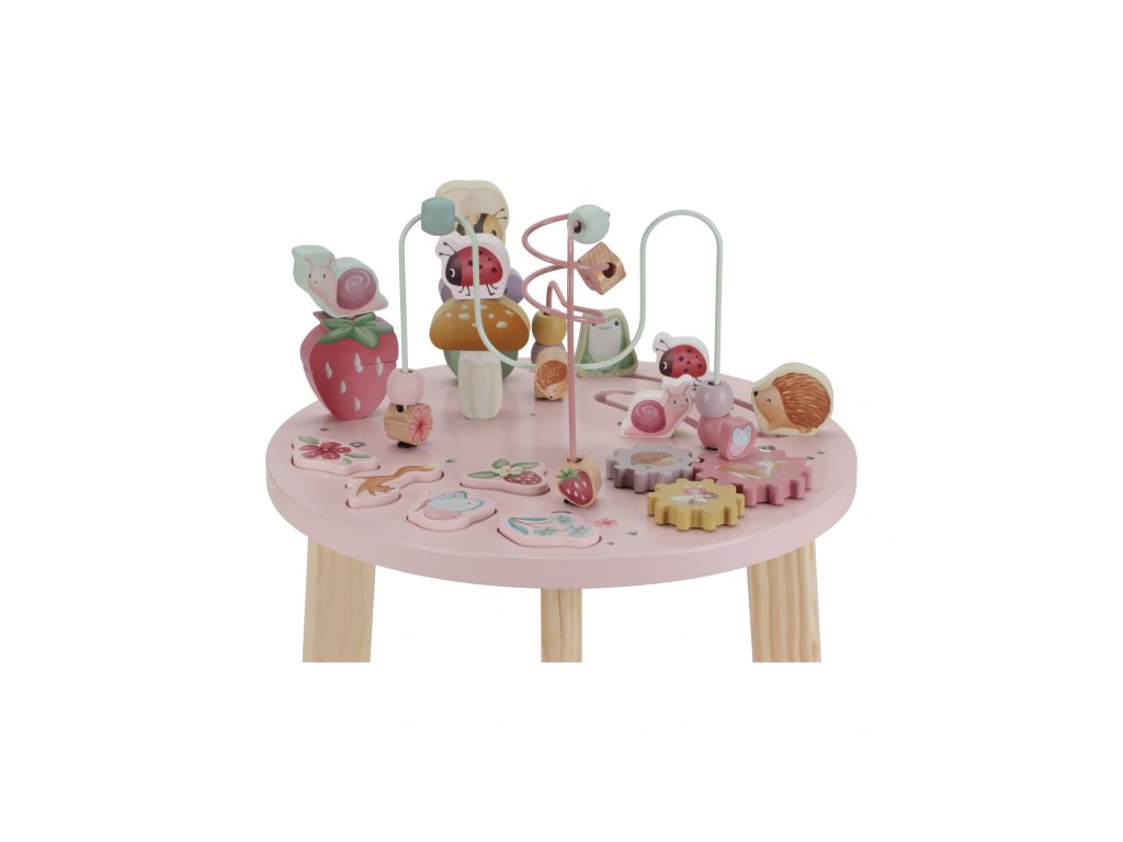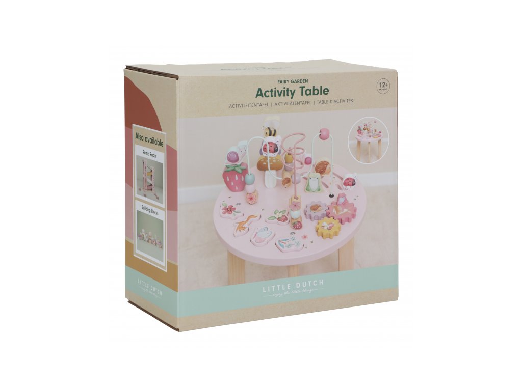 Dřevěný multifunkční stolek v krásném a vysoce kvalitním provedení nabízí vašemu dítěti množství různorodých aktivit, které dítě zabaví a zároveň pomáhají rozvíjet jeho jemnou motoriku i jednotlivé smysly. Lákat dítě ke zkoumání budou pohyblivé, posuvné i odnímatelné dřevěné díly v podobě ježka, šneka, berušky, jahůdky a dalších motivů ze života na zahradě. Díky stabilnímu dřevěnému provedení je stolek vhodný i pro děti, které hledají oporu při prvních krůčcích. Stolek je součástí designové kolekce hraček a doplňků Little Dutch Fairy Garden inspirované životem na zahradě. Vyrobeno z dřeva certifikovaného FSC. Rozměry: 39 x 39 x 54 cm Vhodné pro děti od 12 měsíců.