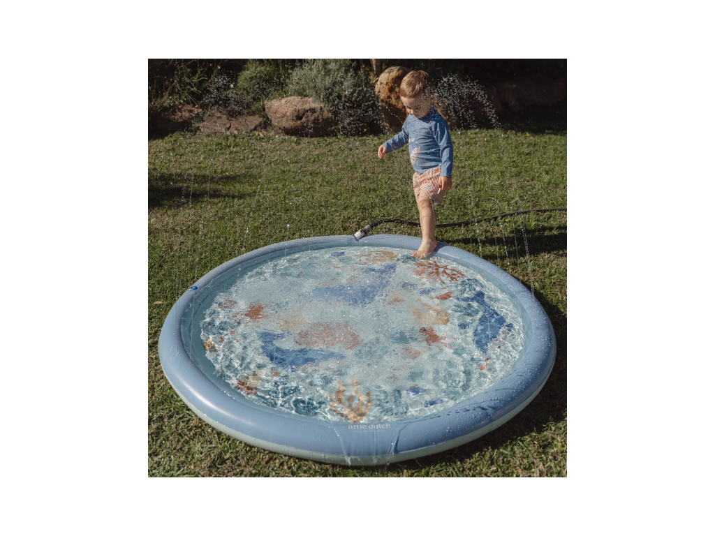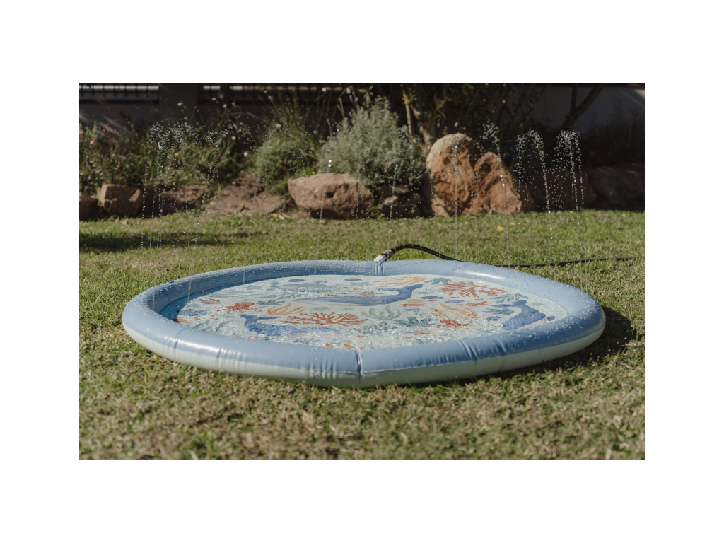 Originální hrací podložka s vodotryskem, který vytvoříte jednoduše připojením na zahradní hadici s pomocí přiložené spojky.