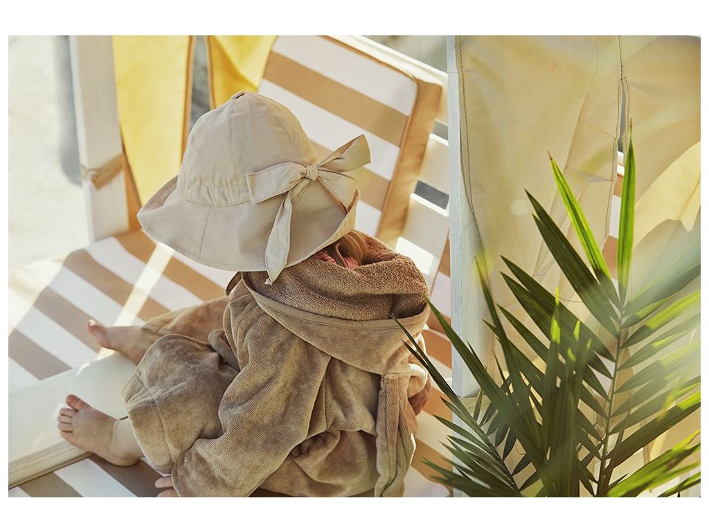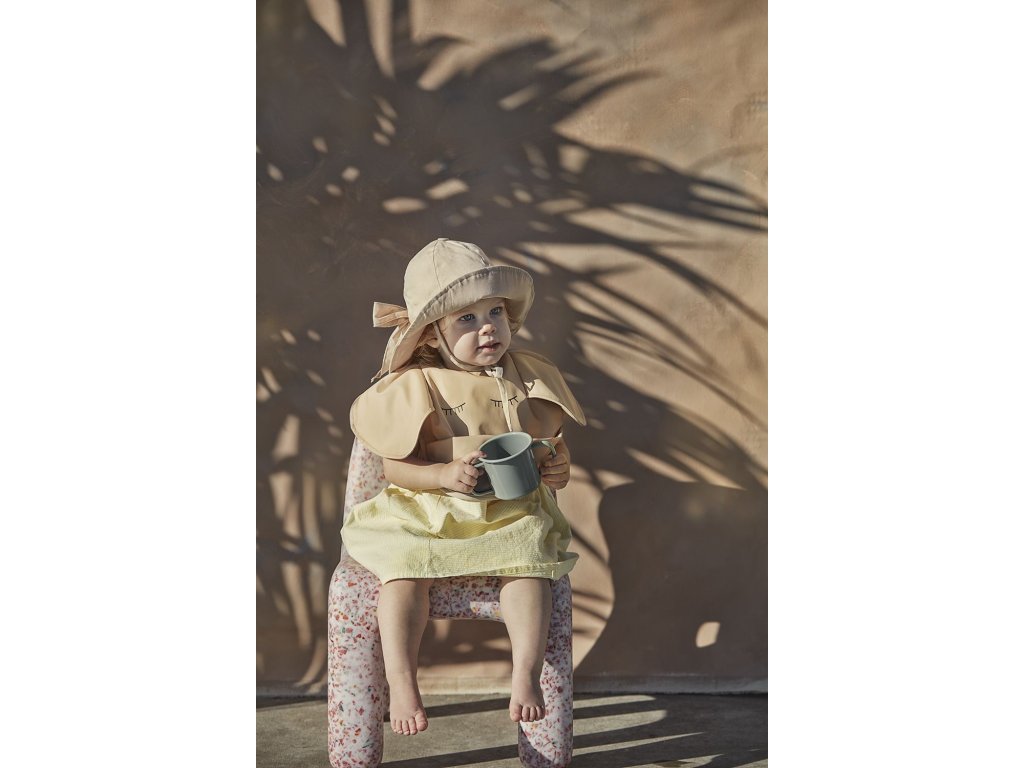 Krásný a pohodlný klobouček z nové jarní kolekce ochrání vaše dítko před sluníčkem. Klobouček má široký okraj, který se dá ohrnout a šňůrky na zavázání pod krkem. Klobouček má UV filtr 30.