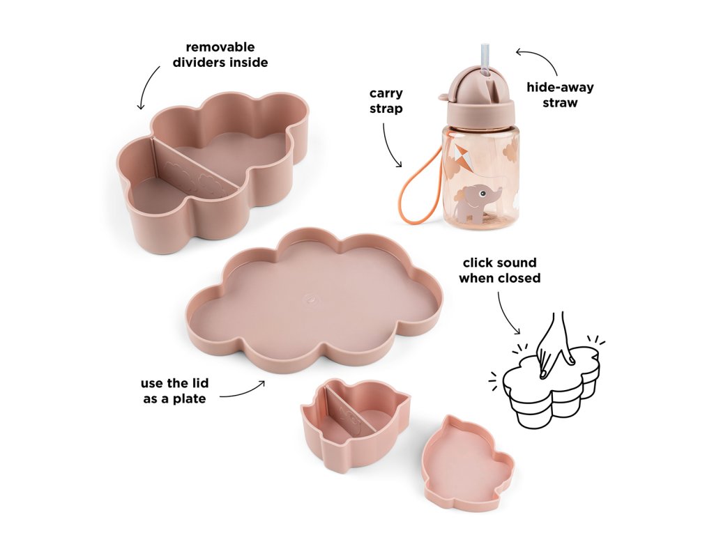 Tato sada krabiček na oběd a svačinu v hezké barvě je ideální pro každodenní dobrodružství vašeho dítěte. Sada obsahuje láhev s brčkem a víčkem odolným proti vylití. Boxy na svačinu a oběd jsou vybaveny praktickými přepážkami pro organizované uspořádání.